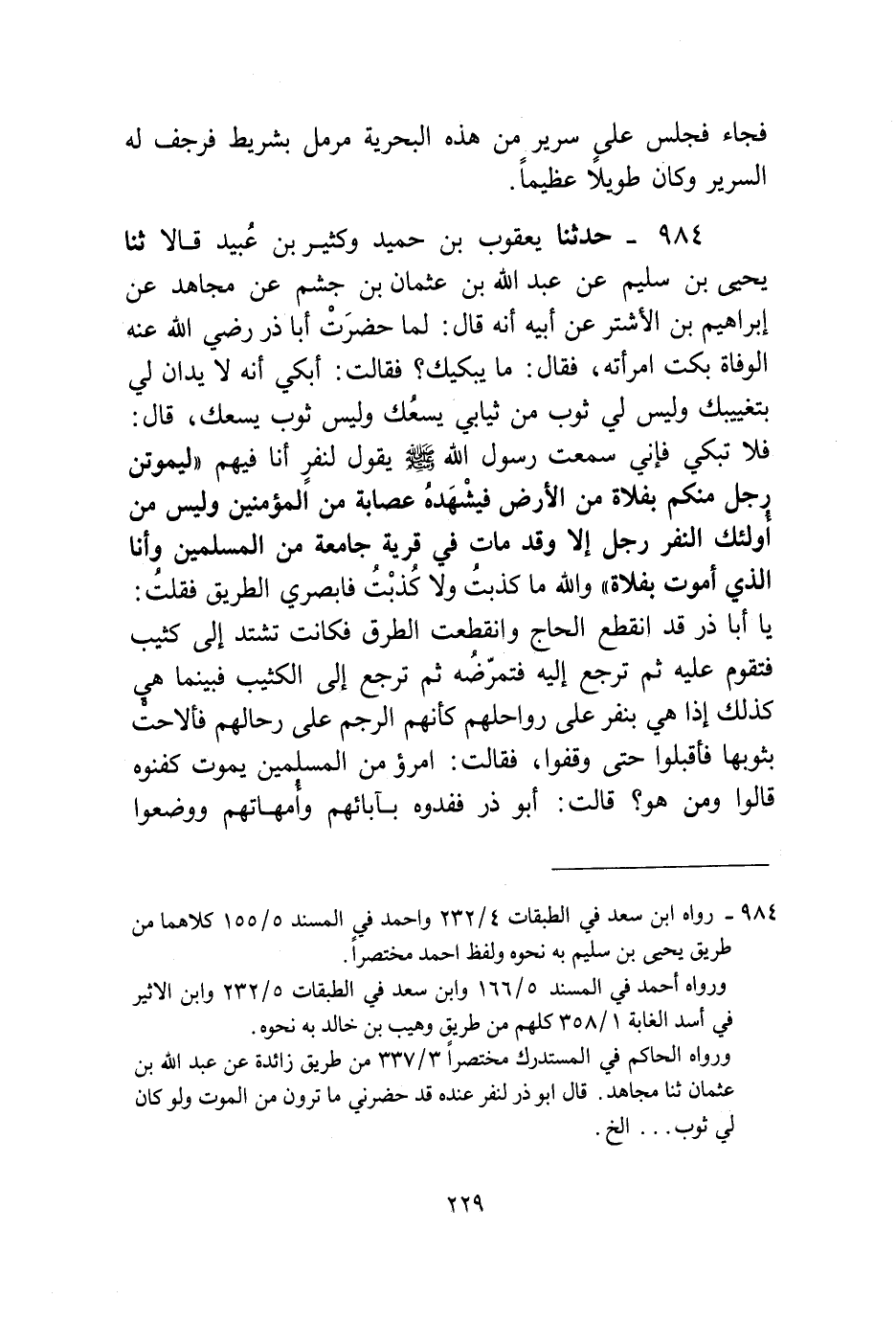 984 - حَدَّثَنَا يَعْقُوبُ بْنُ حُمَيْدٍ، وَكَثِيرُ بْنُ عُبَيْدٍ، قَالَا: ثنا يَحْيَى بْنُ سُلَيْمٍ، عَنْ عَبْدِ اللَّهِ بْنِ عُثْمَانَ بْنِ جُشَمَ، عَنْ مُجَاهِدٍ، عَنْ إِبْرَاهِيمَ بْنِ الْأَشْتَرِ، عَنْ أَبِيهِ أَنَّهُ قَالَ: لَمَّا حَضَرَتْ أَبَا ذَرٍّ رَضِيَ اللَّهُ عَنْهُ الْوَفَاةُ بَكَتِ امْرَأَتُهُ، فَقَالَ: مَا يُبْكِيكِ؟ فَقَالَتْ: أَبْكِي أَنَّهُ لَا يَدَانِ لِي بِتَغْيِيبِكَ، وَلَيْسَ لِي ثَوْبٌ مِنْ ثِيَابِي يَسَعُكَ، وَلَيْسَ ثَوْبٌ يَسَعُكَ، قَالَ: فَلَا تَبْكِي، فَإِنِّي سَمِعْتُ رَسُولَ اللَّهِ صَلَّى اللهُ عَلَيْهِ وَسَلَّمَ يَقُولُ لِنَفَرٍ أَنَا فِيهِمْ: «§لَيَمُوتَنَّ رَجُلٌ مِنْكُمْ بِفَلَاةٍ مِنَ الْأَرْضِ فَيَشْهَدُهُ عِصَابَةٌ مِنَ الْمُؤْمِنِينَ» ، وَلَيْسَ مِنْ أُولَئِكَ النَّفَرِ رَجُلٌ إِلَّا وَقَدْ مَاتَ فِي قَرْيَةٍ جَامِعَةٍ مِنَ الْمُسْلِمِينَ، وَأَنَا الَّذِي أَمُوتُ بِفَلَاةٍ، وَاللَّهِ مَا كَذَبْتُ وَلَا كُذِّبْتُ، فَأَبْصِرِي الطَّرِيقَ، فَقُلْتُ: يَا أَبَا ذَرٍّ قَدِ انْقَطَعَ الْحَاجُّ، وَانْقَطَعَتِ الطُّرُقُ، فَكَانَتْ تَشْتَدُّ إِلَى كَثِيبٍ فَتَقُومُ عَلَيْهِ ثُمَّ تَرْجِعُ إِلَيْهِ فَتُمَرِّضُهُ، ثُمَّ تَرْجِعُ إِلَى الْكَثِيبِ، فَبَيْنَمَا هِيَ كَذَلِكَ إِذَا هِيَ بِنَفَرٍ عَلَى رَوَاحِلِهِمْ كَأَنَّهُمُ الرُّجْمُ عَلَى رِحَالِهِمْ، فَأَلَاحَتْ بِثَوْبِهَا، فَأَقْبَلُوا حَتَّى وَقَفُوا، فَقَالَتِ: امْرُؤٌ مِنَ الْمُسْلِمِينَ يَمُوتُ كَفِّنُوهُ، قَالُوا: وَمَنْ هُوَ؟ قَالَتْ: أَبُو ذَرٍّ، فَفَدَوْهُ بِآبَائِهِمْ وَأُمَّهَاتِهِمْ، وَوَضَعُوا السِّيَاطَ نَحْوَهَا يَسْتَبِقُونَ إِلَيْهِ حَتَّى جَاؤُوهُ، فَقَالَ: أَبْشِرُوا، وَحَدَّثَهُمُ الْحَدِيثَ الَّذِي قَالَ، ثُمَّ قَالَ: أَنْتُمْ تَسْمَعُونَ، لَوْ كَانَ لِي ثَوْبٌ يَسَعُنِي لَمْ أُكَفَّنْ إِلَّا فِي ثَوْبٍ هُوَ لِي أَوْ لِامْرَأَتِي ثَوْبٍ يَسَعُنِي لَمْ أُكَفَّنْ إِلَّا فِي ثَوْبِهَا فَأَنْشُدُكُمُ اللَّهُ عَزَّ وَجَلَّ وَالْإِسْلَامَ أَنْ لَا يُكَفِّنِّي رَجُلٌ كَانَ أَمِيرًا، أَوْ عَرِيفًا، أَوْ بَرِيدًا، أَوْ نَقِيبًا، وَكُلُّ الْقَوْمِ كَانَ قَدْ فَارَقَ بَعْضَ ذَلِكَ إِلَّا فَتًى مِنَ الْأَنْصَارِ، قَالَ: أَنَا أُكَفِّنُكَ، لَمْ أُصِبْ مِمَّا ذِكَرْتَ شَيْئًا فِي رِدَائِي هَذَا الَّذِي عَلَيَّ، وَفِي ثَوْبَيْنِ فِي عَيْبَتِي مِنْ غَزْلِ أُمِّي، فَقَالَ: أَنْتَ تُكَفِّنُنِي، قَالَ: فَكَفَّنَهُ الْأَنْصَارِيُّ فِي النَّفَرِ الَّذِينَ شَهِدُوا، مِنْهُمْ حُجْرُ بْنُ الْأَدْبَرِ، وَمَالِكُ بْنُ الْأَشْتَرِ فِي نَفَرٍ كُلُّهُمْ يَمَانٍ