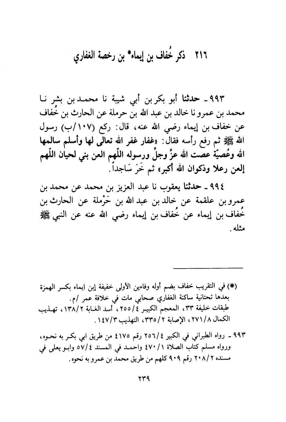 993 - حَدَّثَنَا أَبُو بَكْرِ بْنُ أَبِي شَيْبَةَ، نا مُحَمَّدُ بْنُ بِشْرٍ، نا مُحَمَّدُ بْنُ عَمْرٍو، نا خَالِدُ بْنُ عَبْدِ اللَّهِ بْنِ حَرْمَلَةَ، عَنِ الْحَارِثِ بْنِ خِفَافٍ، عَنْ خِفَافِ بْنِ إِيمَاءٍ رَضِيَ اللَّهُ عَنْهُ قَالَ: رَكَعَ رَسُولُ اللَّهِ صَلَّى اللهُ عَلَيْهِ وَسَلَّمَ ثُمَّ رَفَعَ رَأْسَهُ فَقَالَ: «§غِفَارٌ غَفَرَ اللَّهُ تَعَالَى لَهَا، وَأَسْلَمُ سَالَمَهَا اللَّهُ، وَعُصَيَّةُ عَصَتِ اللَّهَ عَزَّ وَجَلَّ وَرَسُولَهُ، اللَّهُمَّ الْعَنْ بَنِي لِحْيَانَ، اللَّهُمَّ الْعَنْ رِعْلًا وَذَكْوَانَ، اللَّهُ أَكْبَرُ» ، ثُمَّ خَرَّ سَاجِدًا،
