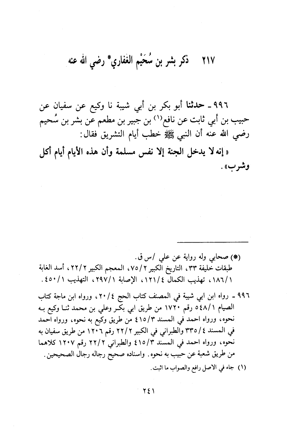 996 - حَدَّثَنَا أَبُو بَكْرِ بْنُ أَبِي شَيْبَةَ، نا وَكِيعٌ، عَنْ سُفْيَانَ، عَنِ حَبِيبِ بْنِ أَبِي ثَابِتٍ، عَنْ نَافِعِ بْنِ جُبَيْرِ بْنِ مُطْعِمٍ، عَنْ بِشْرِ بْنِ سُحَيْمٍ رَضِيَ اللَّهُ عَنْهُ، أَنَّ النَّبِيَّ صَلَّى اللهُ عَلَيْهِ وَسَلَّمَ خَطَبَ أَيَّامَ التَّشْرِيقِ، فَقَالَ: «إِنَّهُ §لَا يَدْخُلُ الْجَنَّةَ إِلَّا نَفْسٌ مَسْلَمَةٌ، وَإِنَّ هَذِهِ الْأَيَّامَ أَيَّامُ أَكْلٍ وَشُرْبٍ»