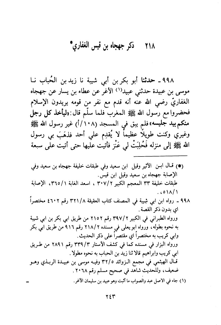 998 - حَدَّثَنَا أَبُو بَكْرِ بْنُ أَبِي شَيْبَةَ، نا زَيْدُ بْنُ الْحُبَابٍ، نا مُوسَى بْنُ عُبَيْدَةَ، حَدَّثَنِي عُبَيْدٌ الْأَغَرُّ، عَنْ عَطَاءِ بْنِ يَسَارٍ، عَنْ جَهْجَاهُ الْغِفَارِيِّ رَضِيَ اللَّهُ عَنْهُ، أَنَّهُ قَدِمَ مَعَ نَفَرٍ مِنْ قَوْمِهِ يُرِيدُونَ الْإِسْلَامَ، فَحَضَرُوا مَعَ رَسُولِ اللَّهِ صَلَّى اللهُ عَلَيْهِ وَسَلَّمَ الْمَغْرِبَ، فَلَمَّا سَلَّمَ قَالَ: «لِيَأْخُذْ كُلُّ رَجُلٍ مِنْكُمْ بَيْدِ جَلِيسِهِ» ، فَلَمْ يَبْقَ فِي الْمَسْجِدِ غَيْرُ رَسُولِ اللَّهِ صَلَّى اللهُ عَلَيْهِ وَسَلَّمَ وَغَيْرِي، وَكُنْتُ طَوِيلًا عَظِيمًا لَا يَقْدَمُ عَلَيَّ أَحَدٌ، فَذَهَبَ بِي رَسُولُ اللَّهِ صَلَّى اللهُ عَلَيْهِ وَسَلَّمَ إِلَى مَنْزِلِهِ، فَحُلِبَتْ لِي عَنْزٌ، فَأَتَيْتُ عَلَيْهَا حَتَّى أَتَيْتُ عَلَى سَبْعِ -[244]- أَعْنُزٍ فَأَتَيْتُ عَلَيْهَا، ثُمَّ أُتِيتُ بِصَنيعِ بُرْمَةٍ فَأَتَيْتُ عَلَيْهَا، فَقَالَتْ أُمُّ أَيْمَنَ: أَجَاعَ اللَّهُ مَنْ أَجَاعَ رَسُولَ اللَّهِ صَلَّى اللهُ عَلَيْهِ وَسَلَّمَ هَذِهِ اللَّيْلَةَ، فَقَالَ: «مَهْ يَا أُمَّ أَيْمَنَ، أَكَلَ رِزْقَهُ، وَرِزْقُنَا عَلَى اللَّهِ تَعَالَى» ، فَأَصْبَحُوا فَغَدَوْا، فَاجْتَمَعَ هُوَ وَأَصْحَابُهُ فَجَعَلَ يُخْبِرُ كُلُّ رَجُلٍ مِنْهُمْ بِمَا أَتَى إِلَيْهِ، فَقَالَ جَهْجَاهُ: حُلِبَتْ لِي سَبْعُ أَعْنُزٍ فَأَتَيْتُ عَلَيْهَا، وَصَنيِعُ بُرْمَةٍ فَأَتَيْتُ عَلَيْهَا، فَصَلُّوا مَعَ رَسُولِ اللَّهِ صَلَّى اللهُ عَلَيْهِ وَسَلَّمَ الْمَغْرِبَ، فَقَالَ: «لِيَأْخُذْ كُلُّ رَجُلٍ مِنْكُمْ بِجَلِيسِهِ» ، فَلَمْ يَبْقَ غَيْرِي وَغَيْرُ رَسُولِ اللَّهِ صَلَّى اللهُ عَلَيْهِ وَسَلَّمَ، وَكُنْتُ طَوِيلًا عَظِيمًا لَا يَقْدَمُ عَلَيَّ أَحَدٌ، فَذَهَبَ بِي رَسُولُ اللَّهِ صَلَّى اللهُ عَلَيْهِ وَسَلَّمَ، فَحُلِبَتْ لِي عَنْزٌ فَرَوِيتُ وَشَبِعْتُ، فَقَالَتْ أُمُّ أَيْمَنَ: أَلَيْسَ ضَيْفَنَا يَا رَسُولَ اللَّهِ؟ فَقَالَ: «بَلَى» ، فَقَالَ رَسُولُ اللَّهِ صَلَّى اللهُ عَلَيْهِ وَسَلَّمَ: «إِنَّهُ أَكَلَ فِي مِعَاءِ مُؤْمِنٍ اللَّيْلَةَ، وَأَكَلَ قَبْلَ ذَلِكَ فِي مِعَاءِ كَافِرٍ، §وَالْكَافِرُ يَأْكُلُ فِي سَبْعَةِ أَمْعَاءٍ، وَالْمُؤْمِنُ يَأْكُلُ فِي مِعَاءٍ وَاحِدٍ»