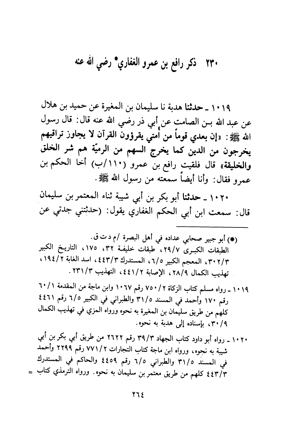 1019 - حَدَّثَنَا هُدْبَةُ، نا سُلَيْمَانُ بْنُ الْمُغِيرَةِ، عَنْ حُمَيْدِ بْنِ هِلَالٍ، عَنْ عَبْدِ اللَّهِ بْنِ الصَّامِتِ، عَنْ أَبِي ذَرٍّ رَضِيَ اللَّهُ عَنْهُ قَالَ: قَالَ رَسُولُ اللَّهِ صَلَّى اللهُ عَلَيْهِ وَسَلَّمَ: «إِنَّ §بَعْدِي قَوْمًا مِنْ أُمَّتِي يَقْرَءُونَ الْقُرْآنَ، لَا يُجَاوِزُ تَرَاقِيَهُمْ، يَخْرُجُونَ مِنَ الدِّينِ كَمَا يَخْرُجُ السَّهْمُ مِنَ الرَّمِيَّةِ، هُمْ شَرُّ الْخَلْقِ وَالْخَلِيقَةِ» ، قَالَ: فَلَقِيتُ رَافِعَ بْنَ عَمْرٍو أَخَا الْحَكَمِ بْنِ عَمْرٍو فَقَالَ: وَأَنَا أَيْضًا سَمِعَتْهُ مِنْ رَسُولِ اللَّهِ صَلَّى اللهُ عَلَيْهِ وَسَلَّمَ
