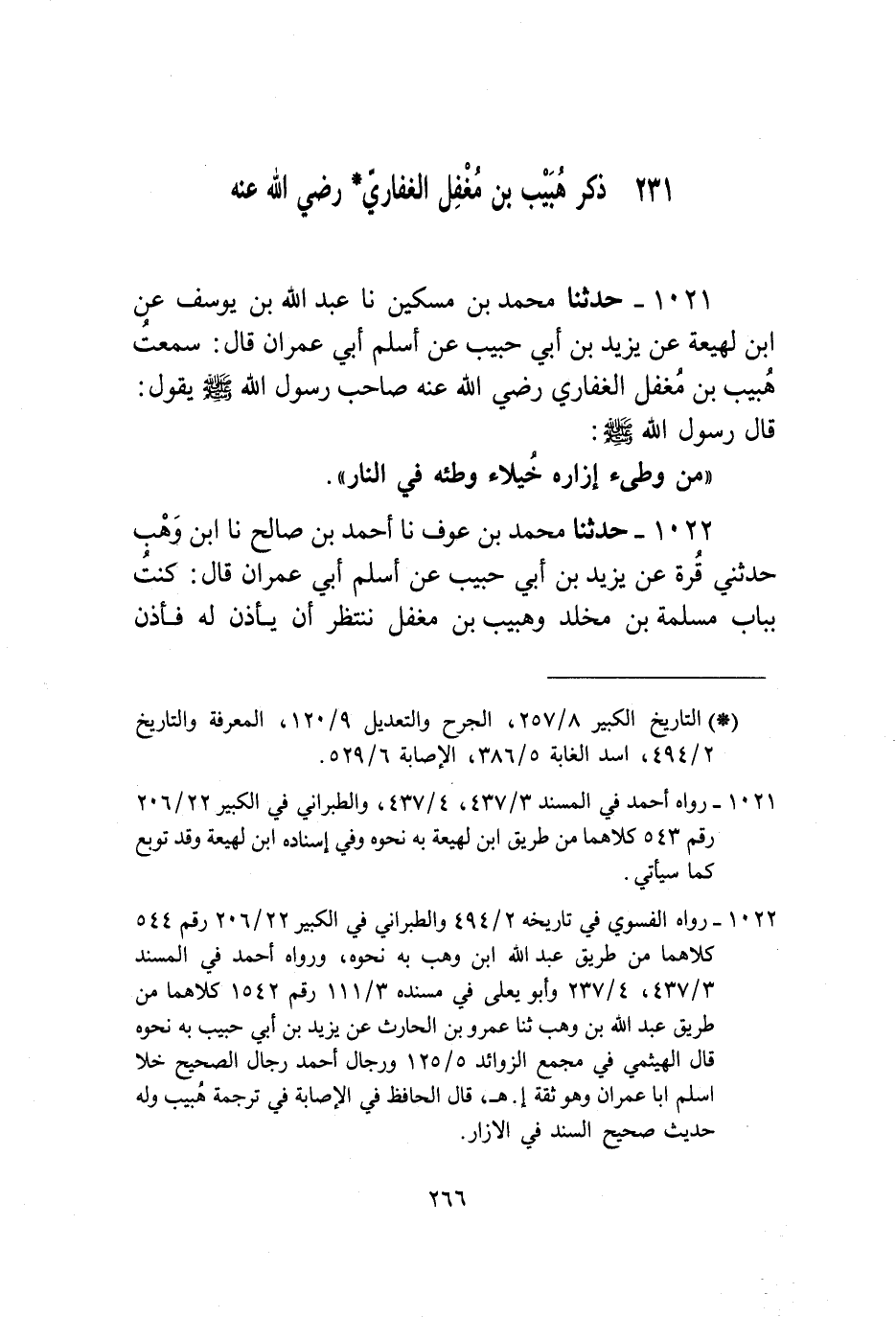 1021 - حَدَّثَنَا مُحَمَّدُ بْنُ مِسْكِينٍ، نا عَبْدُ اللَّهِ بْنُ يُوسُفَ، عَنِ ابْنِ لَهِيعَةَ، عَنْ يَزِيدَ بْنِ أَبِي حَبِيبٍ، عَنْ أَسْلَمَ أَبِي عِمْرَانَ قَالَ: سَمِعْتُ هُبَيْبَ بْنَ مُغَفَّلٍ الْغِفَارِيَّ رَضِيَ اللَّهُ عَنْهُ صَاحِبَ رَسُولِ اللَّهِ صَلَّى اللهُ عَلَيْهِ وَسَلَّمَ يَقُولُ: قَالَ رَسُولُ اللَّهِ صَلَّى اللهُ عَلَيْهِ وَسَلَّمَ: «§مَنْ وَطِئَ إِزَارَهُ خُيَلَاءً وَطِئَهُ فِي النَّارِ»