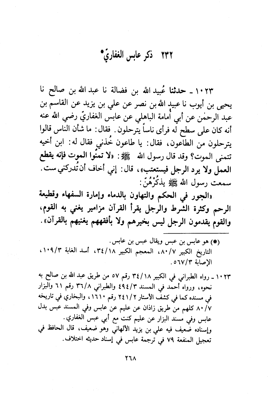 1023 - حَدَّثَنَا عُبَيْدُ اللَّهِ بْنُ فَضَالَةَ، نا عَبْدُ اللَّهِ بْنُ صَالِحٍ، نا يَحْيَى بْنُ أَيُّوبَ، نا عُبَيْدُ اللَّهِ بْنُ نَصْرٍ، عَنْ عَلِيِّ بْنِ يَزِيدَ، عَنِ الْقَاسِمِ بْنِ عَبْدِ الرَّحْمَنِ، عَنْ أَبِي أُمَامَةَ الْبَاهِلِيِّ، عَنْ عَابِسٍ الْغِفَارِيِّ رَضِيَ اللَّهُ عَنْهُ، أَنَّهُ كَانَ عَلَى سَطْحٍ لَهُ فَرَأَى نَاسًا يَتَرَحَّلُونَ، فَقَالَ: مَا شَأْنُ النَّاسِ؟ قَالُوا: يَتَرَحَّلُونَ مِنَ الطَّاعُونِ، فَقَالَ: يَا طَاعُونُ خُذْنِي، فَقَالَ لَهُ ابْنُ أَخِيهِ: تَتَمَنَّى الْمَوْتَ؟ وَقَدْ قَالَ رَسُولُ اللَّهِ صَلَّى اللهُ عَلَيْهِ وَسَلَّمَ: «§لَا تَمَنَّوُا الْمَوْتَ، فَإِنَّهُ يَقْطَعُ الْعَمَلَ، وَلَا يَرُدُّ الرَّجُلَ فَيُسْتَعْتَبَ» ، قَالَ: إِنِّي أَخَافُ أَنْ تُدْرِكَنِي سِتٌّ سَمِعْتُ رَسُولَ اللَّهِ صَلَّى اللهُ عَلَيْهِ وَسَلَّمَ يَذْكُرُهُنَّ: «الْجَوْرُ فِي الْحُكْمِ، وَالتَّهَاوُنُ بِالدِّمَاءِ، وَإِمَارَةُ السُّفَهَاءِ، وَقَطِيعَةُ الرَّحِمِ، وَكَثْرَةُ الشُّرَطِ، وَالرَّجُلُ يَقْرَأُ الْقُرْآنَ مَزَامِيرَ يُغْنِّي بِهِ الْقَوْمَ، وَالْقَوْمُ يُقَدِّمُونَ الرَّجُلَ لَيْسَ بِخَيْرِهِمْ وَلَا بِأَفْقَهِهِمْ يُغَنِّيهِمْ بِالْقُرْآنِ»