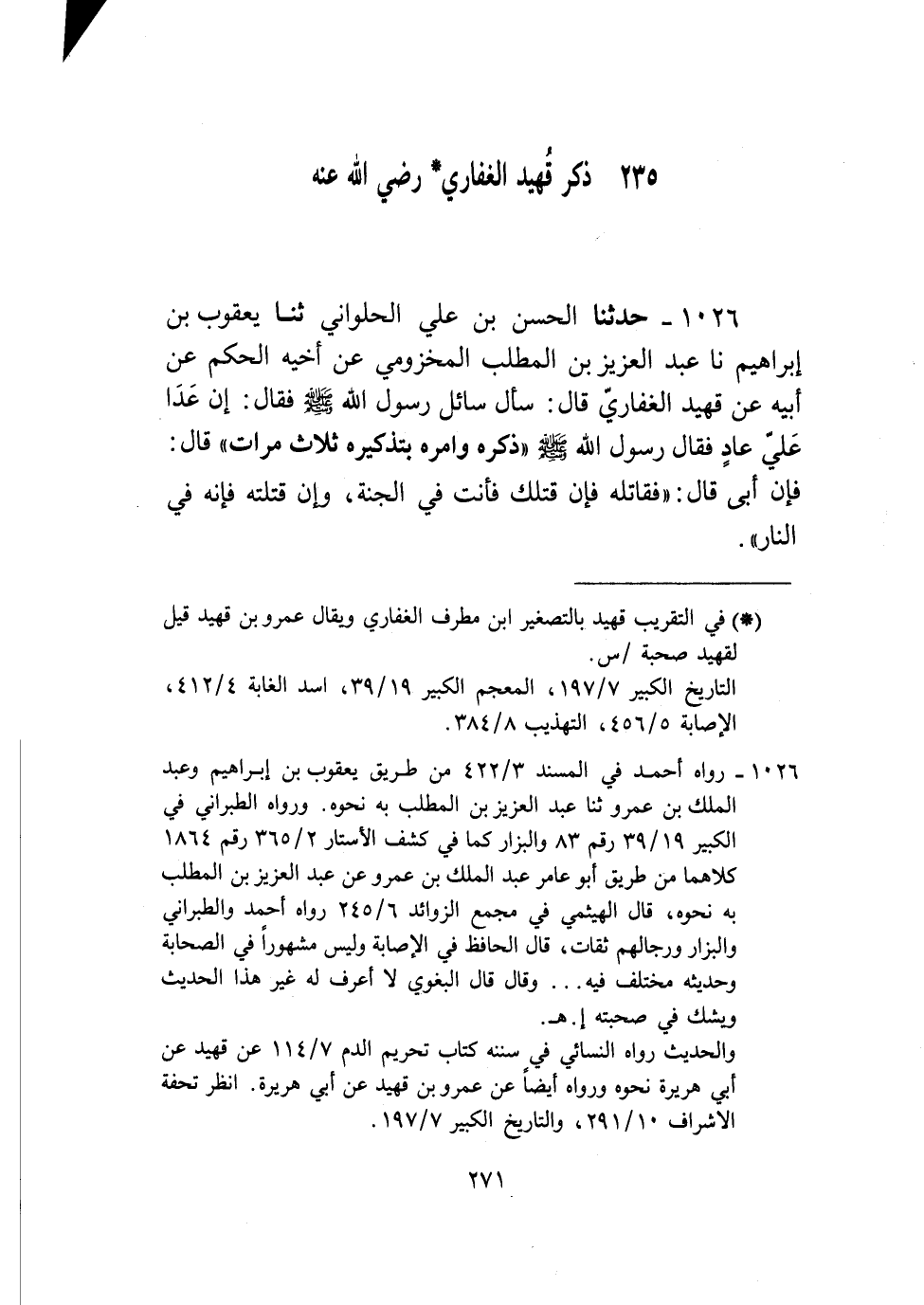 1026 - حَدَّثَنَا الْحَسَنُ بْنُ عَلِيٍّ الْحُلْوَانِيُّ، ثنا يَعْقُوبُ بْنُ إِبْرَاهِيمَ، نا عَبْدُ الْعَزِيزِ بْنُ الْمُطَّلِبِ الْمَخْزُومِيُّ، عَنْ أَخِيهِ الْحَكَمِ، عَنْ أَبِيهِ، عَنْ قُهَيْدٍ الْغِفَارِيِّ قَالَ: سَأَلَ سَائِلٌ رَسُولَ اللَّهِ صَلَّى اللهُ عَلَيْهِ وَسَلَّمَ فَقَالَ: إِنْ عَدَا عَلَيَّ عَادٍ، فَقَالَ رَسُولُ اللَّهِ صَلَّى اللهُ عَلَيْهِ وَسَلَّمَ: «ذَكِّرْهُ» ، وَأَمَرَهُ بِتَذْكِيرِهِ ثَلَاثَ مَرَّاتٍ، قَالَ: فَإِنْ أَبَى؟ قَالَ: «§فَقَاتِلْهُ، فَإِنْ قَتَلَكَ فَأَنْتَ فِي الْجَنَّةِ، وَإِنْ قَتَلْتَهُ فَإِنَّهُ فِي النَّارِ»