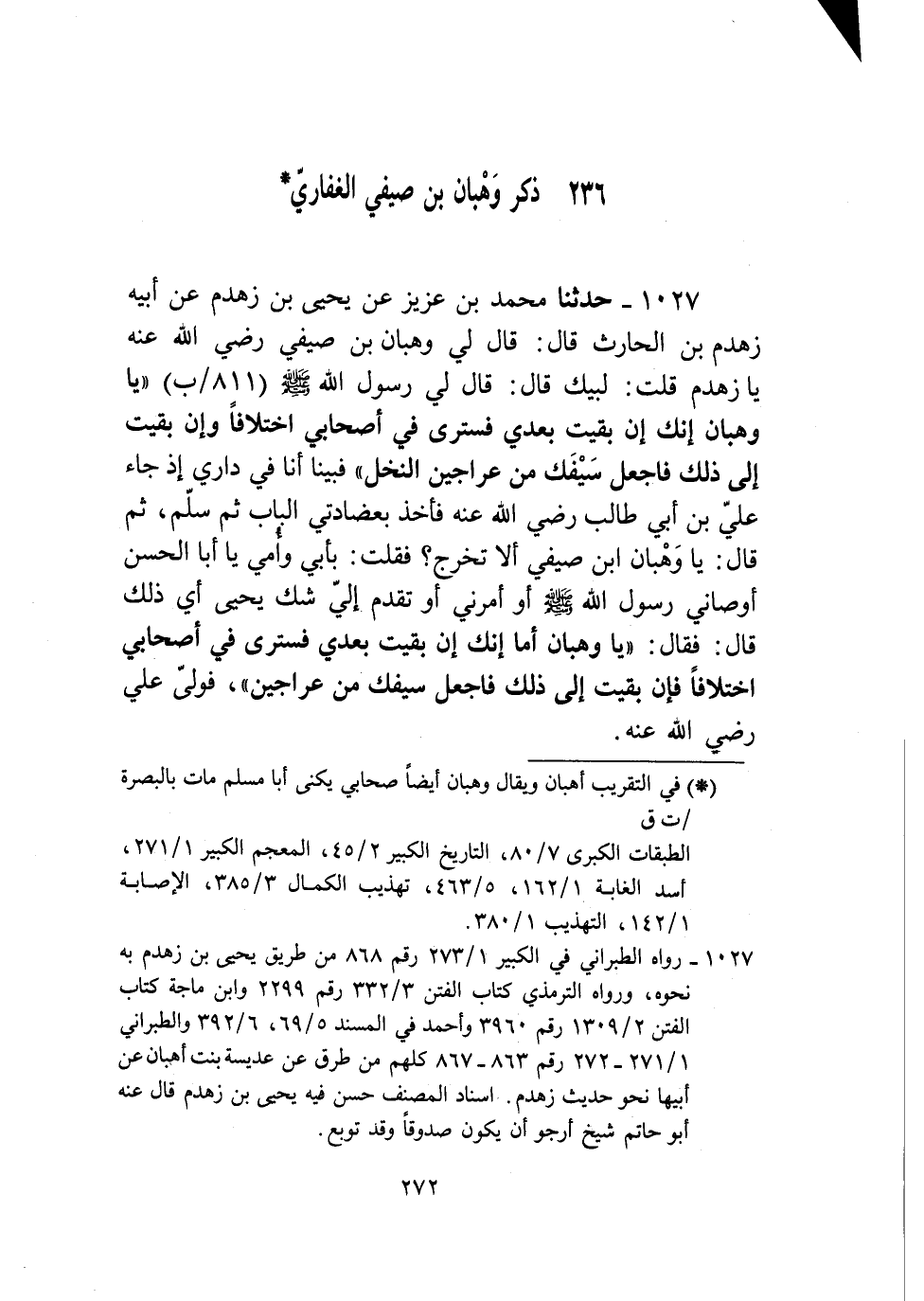 1027 - حَدَّثَنَا مُحَمَّدُ بْنُ عَزِيزٍ، عَنْ يَحْيَى بْنِ زَهْدَمَ، عَنْ أَبِيهِ زَهْدَمَ بْنِ الْحَارِثِ قَالَ: قَالَ لِي وَهْبَانُ بْنُ صَيْفِيٍّ رَضِيَ اللَّهُ عَنْهُ: يَا زَهْدَمُ، قُلْتُ: لَبَّيْكَ، قَالَ: قَالَ لِي رَسُولُ اللَّهِ صَلَّى اللهُ عَلَيْهِ وَسَلَّمَ: «يَا وَهْبَانُ، إِنَّكَ §إِنْ بَقِيتَ بَعْدِي فَسَتَرَى فِي أَصْحَابِي اخْتِلَافًا، وَإِنْ بَقِيتَ إِلَى ذَلِكَ فَاجْعَلْ سَيْفَكَ مِنْ عَرَاجِينِ النَّخْلِ» ، فَبَيْنَا أَنَا فِي دَارِي إِذْ جَاءَ عَلِيُّ بْنُ أَبِي طَالِبٍ رَضِيَ اللَّهُ عَنْهُ فَأَخَذَ بِعِضَادَتَيِ الْبَابِ ثُمَّ سَلَّمَ ثُمَّ قَالَ: يَا وَهْبَانُ بْنَ صَيْفِيٍّ، أَلَا تَخْرُجُ؟ فَقُلْتُ: بِأَبِي وَأُمِّي يَا أَبَا الْحَسَنِ، أَوْصَانِي رَسُولُ اللَّهِ صَلَّى اللهُ عَلَيْهِ وَسَلَّمَ أَوْ أَمَرَنِي أَوْ تَقَدَّمَ إِلَيَّ ـ شَكَّ يَحْيَى أَيَّ ذَلِكَ قَالَ ـ فَقَالَ: «يَا وَهْبَانُ، أَمَا إِنَّكَ إِنْ بَقِيتَ بَعْدِي فَسَتَرَى فِي أَصْحَابِي اخْتِلَافًا، فَإِنْ بَقِيتَ إِلَى ذَلِكَ فَاجْعَلْ سَيْفَكَ مِنْ عَرَاجِينَ» ، فَوَلَّى عَلِيٌّ رَضِيَ اللَّهُ عَنْهُ
