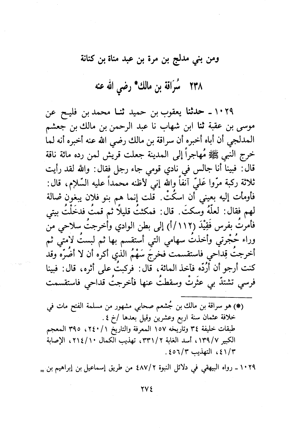 1029 - حَدَّثَنَا يَعْقُوبُ بْنُ حُمَيْدٍ، ثنا مُحَمَّدُ بْنُ فُلَيْحٍ، عَنْ مُوسَى بْنِ عُقْبَةَ، ثَنا ابْنُ شِهَابٍ، نا عَبْدُ الرَّحْمَنِ بْنُ مَالِكِ بْنِ جُعْشُمٍ الْمُدْلِجِيُّ، أَنَّ أَبَاهُ أَخْبَرَهُ، أَنَّ سُرَاقَةَ بْنَ مَالِكٍ رَضِيَ اللَّهُ عَنْهُ أَخْبَرَهُ، أَنَّهُ لَمَّا خَرَجَ النَّبِيُّ صَلَّى اللهُ عَلَيْهِ وَسَلَّمَ مُهَاجِرًا إِلَى الْمَدِينَةِ جَعَلَتْ قُرَيْشٌ لِمَنْ رَدَّهُ مِائَةَ نَاقَةٍ، قَالَ: فَبَيْنَا أَنَا جَالِسٌ فِي نَادِي قَوْمِي جَاءَ رَجُلٌ فَقَالَ: وَاللَّهِ لَقَدْ رَأَيْتُ ثَلَاثَةً رَكَبَةً مَرُّوا عَلَيَّ آنِفًا، وَاللَّهِ إِنِّي لَأَظُنُّهُ مُحَمَّدًا عَلَيْهِ السَّلَامُ، قَالَ: فَأَوْمَأْتُ إِلَيْهِ بِعَيْنَيَّ أَنِ اسْكُتْ، قُلْتُ: إِنَّمَا هُمْ بَنُو فُلَانٍ يَبْغُونَ ضَالَّةً لَهُمْ، فَقَالَ: لَعَلَّهُ، وَسَكَتَ، قَالَ: فَمَكَثْتُ قَلِيلًا ثُمَّ قُمْتُ فَدَخَلْتُ بَيْتِي فَأَمَرْتُ بِفَرَسٍ فَقِيدَ إِلَى بَطْنِ الْوَادِي، أَخْرَجْتُ سِلَاحِي مِنْ وَرَاءِ حُجْرَتِي، وَأَخَذْتُ سِهَامِي الَّتِي أَسْتَقْسِمُ بِهَا، ثُمَّ لَبِسْتُ لَأْمَتِي، ثُمَّ أَخْرَجْتُ قِدَاحِي، فَاسْتَقْسَمْتُ فَخَرَجَ سَهْمُ الَّذِي أَكْرَهُ: أَنْ لَا أَضُرَّهُ، وَقَدْ كُنْتُ أَرْجُو أَنْ أَرُدَّهُ فَآخُذَ الْمِائَةَ، قَالَ: فَرَكِبْتُ عَلَى أَثَرِهِ، قَالَ: فَبَيْنَا فَرَسِي تَشْتَدُّ بِي عَثَرَتْ وَسَقَطْتُ عَنْهَا، فَأَخْرَجْتُ قِدَاحِي فَاسْتَقْسَمْتُ، فَخَرَجَ السَّهْمُ الَّذِي أَكْرَهُ: أَنْ لَا أَضُرَّهُ، فَأَبَيْتُ إِلَّا أَنْ أَتْبَعَهُ فَرَكِبْتُ، فَلَمَّا بَدَا لِيَ الْقَوْمُ وَنَظَرْتُ إِلَيْهِمْ عَثَرَ بِي فَرَسِي، وَذَهَبَتْ يَدَاهُ فِي الْأَرْضِ، وَسَقَطْتُ عَنْهُ، فَاسْتَخْرَجَ يَدَاهُ أَتْبَعَهَا دُخَانٌ مِثْلُ الْغُبَارِ، فَعَرَفْتُ أَنَّهُ قَدْ مُنِعَ مِنِّي وَأَنَّهُ ظَاهِرٌ، فَنَادَيْتُهُمْ فَقُلْتُ: انْظُرُونِي، فَوَاللَّهِ لَا أُرِيبُكُمْ، وَلَا يَأْتِيَكُمْ مِنِّي شَيْءٌ تَكْرَهُونَهُ، فَقَالَ النَّبِيُّ صَلَّى اللهُ عَلَيْهِ وَسَلَّمَ: «قُلْ لَهُ مَا تَبْغِي» ، فَقُلْتُ لَهُ: اكْتُبْ لِي كِتَابًا، فَكَتَبَهُ ثُمَّ أَلْقَاهُ إِلَيَّ، فَسَكَتُّ فَلَمْ أَذْكُرْ شَيْئًا مِمَّا كَانَ، فَلَمَّا فَتَحَ رَسُولُ اللَّهِ صَلَّى اللهُ عَلَيْهِ وَسَلَّمَ مَكَّةَ وَفَرَغَ مِنْ حُنَيْنٍ خَرَجَ إِلَيْهِ وَمَعَهُ الْكِتَابُ الَّذِي كَتَبَهُ لَهُ، قَالَ: فَبَيْنَمَا أَنَا عَامِدٌ لَهُ، دَخَلْتُ بَيْنَ ظَهْرَانَيْ كَتِيبَةٍ مِنْ كَتَائِبِ الْأَنْصَارِ، قَالَ: فَطَفِقُوا يُقَرِّعُونِي بِالرِّمَاحِ وَيَقُولُونَ: إِلَيْكَ إِلَيْكَ، حَتَّى دَنَوْتُ إِلَى رَسُولِ اللَّهِ صَلَّى اللهُ عَلَيْهِ وَسَلَّمَ وَهُوَ عَلَى نَاقَةٍ أَنْظُرُ إِلَى سَاقِهِ فِي غَرَزَةٍ كَأَنَّهَا جُمَّارَةٌ، فَرَفَعْتُ يَدِي بِالْكِتَابِ، فَقَالَ النَّبِيُّ صَلَّى اللهُ عَلَيْهِ وَسَلَّمَ: «§الْيَوْمُ يَوْمُ وَفَاءٍ وَبِرٍّ، ادْنُهْ» ، قَالَ: فَأَسْلَمْتُ ثُمَّ انْصَرَفْتُ، فَسُقْتُ إِلَى النَّبِيِّ صَلَّى اللهُ عَلَيْهِ وَسَلَّمَ صَدَقَتِي -[275]-،