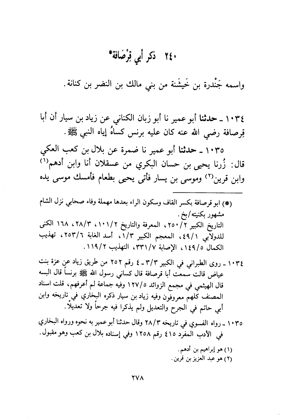 1035 - حَدَّثَنَا أَبُو عُمَيْرٍ، نا ضَمْرَةُ، عَنْ بِلَالِ بْنِ كَعْبٍ الْعَكِّيِّ قَالَ: زُرْنَا يَحْيَى بْنَ حَسَّانٍ الْبَكْرِيَّ مِنْ عَسْقَلَانَ، أَنَا وَابْنُ أَدْهَمَ، وَابْنُ قَرِينٍ، وَمُوسَى بْنُ يَسَارٍ، فَأَتَى يَحْيَى بِطَعَامٍ، فَأَمْسَكَ مُوسَى يَدَهُ، فَقَالَ لَهُ يَحْيَى: كُلْ، فَقَدْ أَمَّنَا رَجُلٌ مِنْ أَصْحَابِ النَّبِيِّ صَلَّى اللهُ عَلَيْهِ وَسَلَّمَ فِي هَذَا الْمَسْجِدِ عِشْرِينَ سَنَةً ـ يُكْنَى أَبَا قِرْصَافَةَ ـ «كَانَ §يَصُومُ يَوْمًا، وَيُفْطِرُ يَوْمًا، فَوُلِدَ لِي غُلَامٌ، فَأَوْلَمْتُ فَدَعَوْتُهُ فِي الْيَوْمِ الَّذِي كَانَ يَصُومُ فِيهِ فَأَفْطَرَ» فَمَدَّ مُوسَى يَدَهُ فَأَكَلَ , وَقَامَ ابْنُ أَدْهَمَ إِلَى الْمَسْجِدِ فَكَنَسَهُ بِيَدِهِ