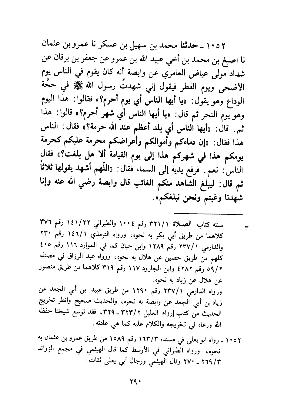 1052 - حَدَّثَنَا مُحَمَّدُ بْنُ سُهَيْلِ بْنِ عَسْكَرٍ، نا عَمْرُو بْنُ عُثْمَانَ، نا أصْبَغَ بْنُ مُحَمَّدٍ ابْنُ أَخِي عُبَيْدِ اللَّهِ بْنِ عَمْرٍو، عَنْ جَعْفَرِ بْنِ بُرْقَانَ، عَنْ شَدَّادٍ، مَوْلَى عِيَاضٍ الْعَامِرِيِّ، عَنْ وَابِصَةَ أَنَّهُ كَانَ يَقُومُ فِي النَّاسِ يَوْمَ الْأَضْحَى وَيَوْمَ الْفِطْرِ فَيَقُولُ: إِنِّي شَهِدْتُ رَسُولَ اللَّهِ صَلَّى اللهُ عَلَيْهِ وَسَلَّمَ فِي حَجَّةِ الْوَدَاعِ وَهُوَ يَقُولُ: «يَا أَيُّهَا النَّاسُ، أَيُّ يَوْمٍ أُحْرِمُ؟» ، فَقَالُوا: هَذَا الْيَوْمُ، وَهُوَ يَوْمُ النَّحْرِ، ثُمَّ قَالَ: «يَا أَيُّهَا النَّاسُ، أَيُّ شَهْرٍ أُحْرِمُ؟» ، قَالُوا: هَذَا، ثُمَّ قَالَ: «أَيُّهَا النَّاسُ، أَيُّ بَلَدٍ أَعْظَمُ عِنْدَ اللَّهِ حُرْمَةً؟» ، فَقَالَ النَّاسُ: هَذَا، فَقَالَ: «إِنَّ §دِمَاءَكُمْ وَأَمْوَالَكُمْ وَأَعْرَاضَكُمْ مُحَرَّمَةٌ عَلَيْكُمْ كَحُرْمَةِ يَوْمِكُمْ هَذَا، فِي شَهْرِكُمْ هَذَا إِلَى يَوْمِ الْقِيَامَةِ، أَلَا هَلْ بَلَّغْتُ؟» ، فَقَالَ النَّاسُ: نَعَمْ، فَرَفَعَ يَدَيْهِ إِلَى السَّمَاءِ فَقَالَ: «اللَّهُمَّ اشْهَدْ» ، يَقُولُهَا ثَلَاثًا، ثُمَّ قَالَ: «لِيُبَلِّغِ الشَّاهِدُ مِنْكُمُ الْغَائِبَ» ، قَالَ وَابِصَةُ رَضِيَ اللَّهُ عَنْهُ: وَإِنَّا شَهِدْنَا وَغِبْتُمْ، وَنَحْنُ نُبَلِّغُكُمْ -[291]-،