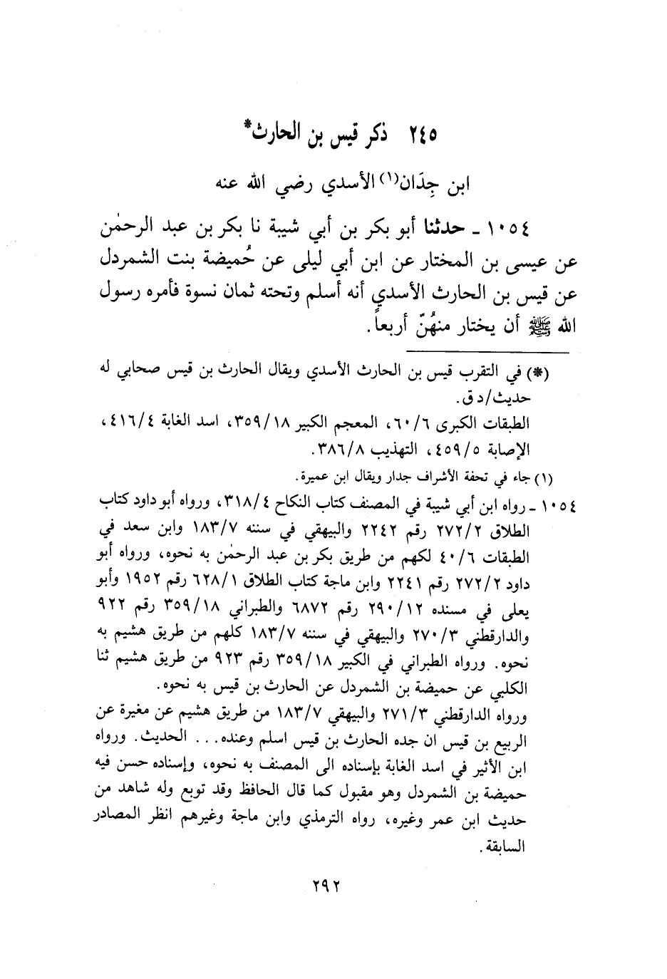 1054 - حَدَّثَنَا أَبُو بَكْرِ بْنُ أَبِي شَيْبَةَ، نا بَكْرُ بْنُ عَبْدِ الرَّحْمَنِ، عَنْ عِيسَى بْنِ الْمُخْتَارِ، عَنِ ابْنِ أَبِي لَيْلَى، عَنْ حُمَيْضَةَ بِنْتِ الشَّمَرْدَلِ، عَنْ قَيْسِ بْنِ الْحَارِثِ الْأَسَدِيِّ، أَنَّهُ «§أَسْلَمَ وَتَحْتَهُ ثَمَانِ نِسْوَةٍ فَأَمَرَهُ رَسُولُ اللَّهِ صَلَّى اللهُ عَلَيْهِ وَسَلَّمَ أَنْ يَخْتَارَ مِنْهُنَّ أَرْبَعًا»