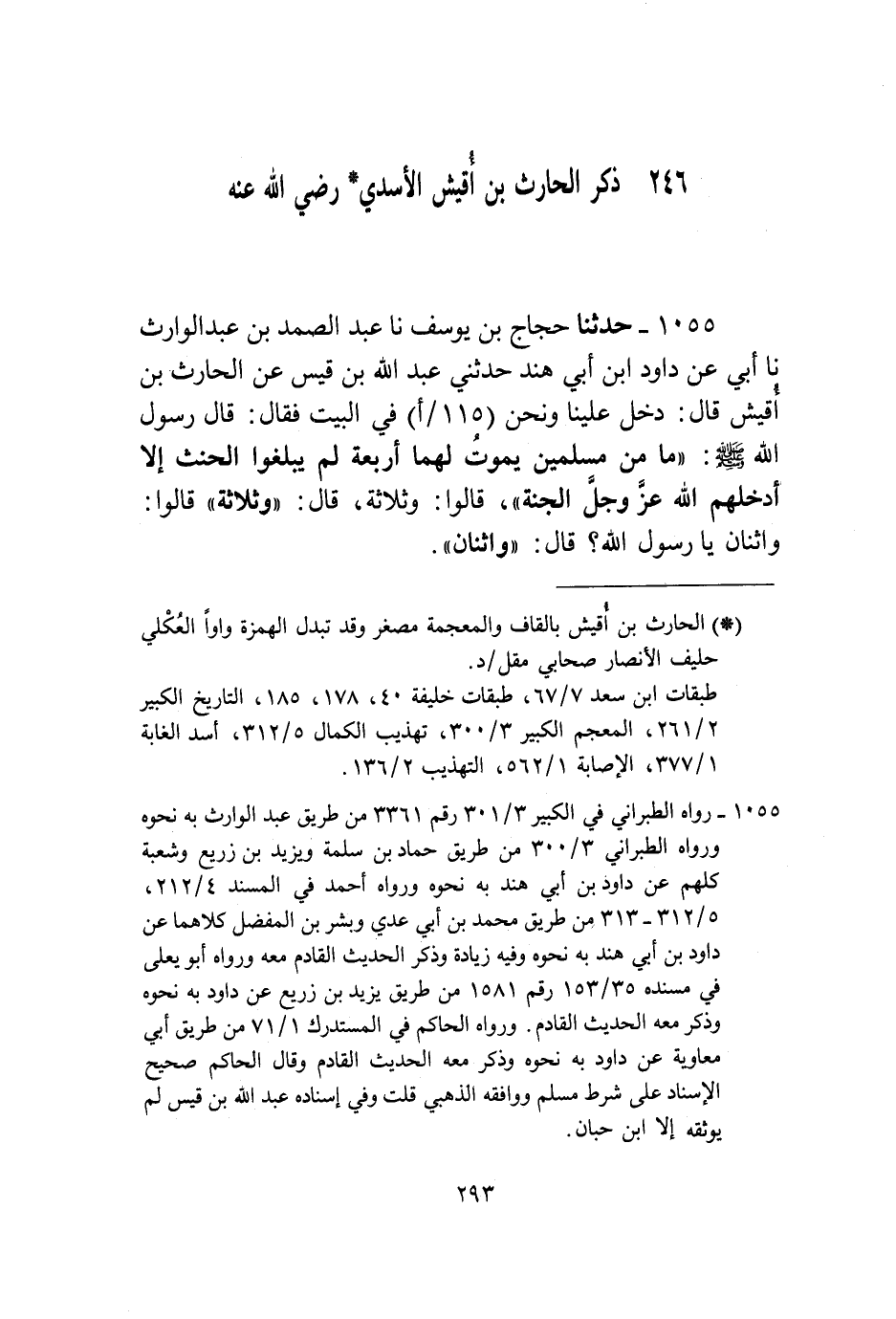 1055 - حَدَّثَنَا حَجَّاجُ بْنُ يُوسُفَ، نا عَبْدُ الصَّمَدِ بْنُ عَبْدِ الْوَارِثِ، نا أَبِي، عَنْ دَاوُدَ بْنِ أَبِي هِنْدَ، حَدَّثَنِي عَبْدُ اللَّهِ بْنُ قَيْسٍ، عَنِ الْحَارِثِ بْنِ أُقَيْشٍ قَالَ: دَخَلَ عَلَيْنَا وَنَحْنُ فِي الْبَيْتِ فَقَالَ: قَالَ رَسُولُ اللَّهِ صَلَّى اللهُ عَلَيْهِ وَسَلَّمَ: «§مَا مِنْ مُسْلِمَيْنِ يَمُوتُ لَهُمَا أَرْبَعَةٌ لَمْ يَبْلُغُوا الْحِنْثَ إِلَّا أَدْخَلَهُمُ اللَّهُ عَزَّ وَجَلَّ الْجَنَّةَ» ، قَالُوا: وَثَلَاثَةٌ؟ قَالَ: «وَثَلَاثَةٌ» ، قَالُوا: وَاثْنَانِ يَا رَسُولَ اللَّهِ؟ قَالَ: «وَاثْنَانِ»