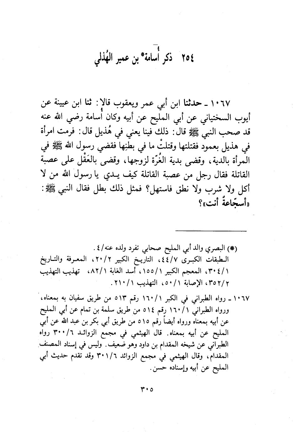 1067 - حَدَّثَنَا ابْنُ أَبِي عُمَرَ، وَيَعْقُوبُ، قَالَا: ثَنا ابْنُ عُيَيْنَةَ، عَنْ أَيُّوبَ السَّخْتِيَانِيِّ، عَنْ أَبِي الْمَلِيحِ، عَنْ أَبِيهِ ـ وَكَانَ أُسَامَةُ رَضِيَ اللَّهُ عَنْهُ قَدْ صَحِبَ النَّبِيَّ صَلَّى اللهُ عَلَيْهِ وَسَلَّمَ ـ قَالَ: ذَلِكَ فِينَا ـ يَعْنِي فِي هُذَيْلٍ ـ قَالَ: فَرَمَتِ امْرَأَةٌ فِي هُذَيْلٍ بِعَمُودٍ فَقَتَلَتْهَا وَقَتَلَتْ مَا فِي بَطْنِهَا، §فَقَضَى رَسُولُ اللَّهِ صَلَّى اللهُ عَلَيْهِ وَسَلَّمَ فِي الْمَرْأَةِ بِالدِّيَةِ، وَقَضَى بِدِيَةِ الْغُرَّةِ لِزَوْجِهَا، وَقَضَى بِالْعَقْلِ عَلَى عُصْبَةِ الْقَاتِلَةِ، فَقَالَ رَجُلٌ مِنْ عُصْبَةِ الْقَاتِلَةِ: كَيْفَ يَدْرِي يَا رَسُولَ اللَّهِ مَنْ لَا أَكَلَ وَلَا شَرِبَ وَلَا نَطَقَ فَاسْتَهَلَّ، فَمِثْلُ ذَلِكَ بَطَلْ؟ فَقَالَ النَّبِيُّ صَلَّى اللهُ عَلَيْهِ وَسَلَّمَ: «أَسَجَّاعَةٌ أَنْتَ؟»