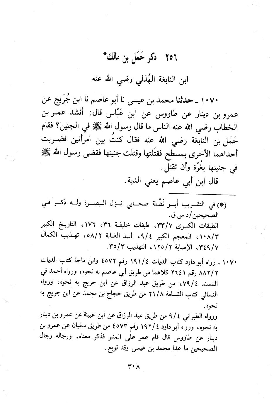 1070 - حَدَّثَنَا مُحَمَّدُ بْنُ عِيسَى، نا أَبُو عَاصِمٍ، نا ابْنُ جُرَيْجٍ، عَنْ عَمْرِو بْنِ دِينَارٍ، عَنْ طَاوُسٍ، عَنِ ابْنِ عَبَّاسٍ قَالَ: أَنْشَدَ عُمَرُ بْنُ الْخَطَّابِ رَضِيَ اللَّهُ عَنْهُ النَّاسَ مَا قَالَ رَسُولُ اللَّهِ صَلَّى اللهُ عَلَيْهِ وَسَلَّمَ فِي الْجَنِينِ، فَقَامَ حَمَلُ بْنُ النَّابِغَةِ رَضِيَ اللَّهُ عَنْهُ فَقَالَ: «§كُنْتُ بَيْنَ امْرَأَتَيْنِ فَضَرَبَتْ إِحْدَاهُمَا الْأُخْرَى بِمِسْطَحٍ فَقَتَلَتْهَا وَقَتَلَتْ جَنِينَهَا، فَقَضَى رَسُولُ اللَّهِ صَلَّى اللهُ عَلَيْهِ وَسَلَّمَ فِي جَنِينِهَا بِغُرَّةٍ وَأَنْ تُقْتَلَ» قَالَ ابْنُ أَبِي عَاصِمٍ: يَعْنِي الدِّيَةَ