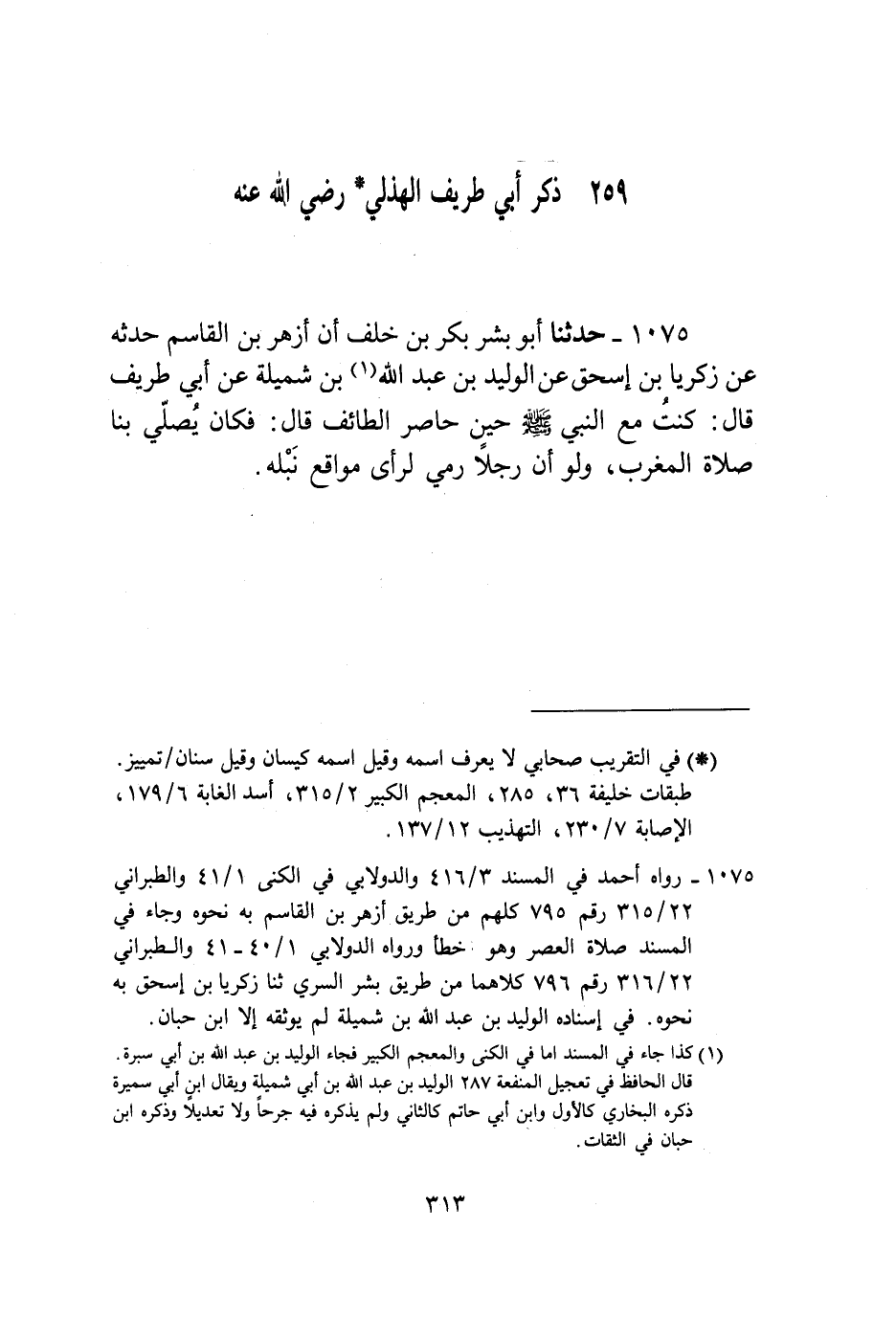 1075 - حَدَّثَنَا أَبُو بِشْرٍ بَكْرُ بْنُ خَلَفٍ، أَنَّ أَزْهَرَ بْنَ الْقَاسِمِ حَدَّثَهُ عَنْ زَكَرِيَّا بْنِ إِسْحَاقَ، عَنِ الْوَلِيدِ بْنِ عَبْدِ اللَّهِ بْنِ شُمَيْلَةَ، عَنْ أَبِي طَرِيفٍ قَالَ: كُنْتُ مَعَ النَّبِيِّ صَلَّى اللهُ عَلَيْهِ وَسَلَّمَ حِينَ حَاصَرَ الطَّائِفَ، قَالَ: «فَكَانَ §يُصَلِّي بِنَا صَلَاةَ الْمَغْرِبِ وَلَوْ أَنَّ رَجُلًا رَمَى لَرَأَى مَوَاقِعَ نَبْلِهِ»