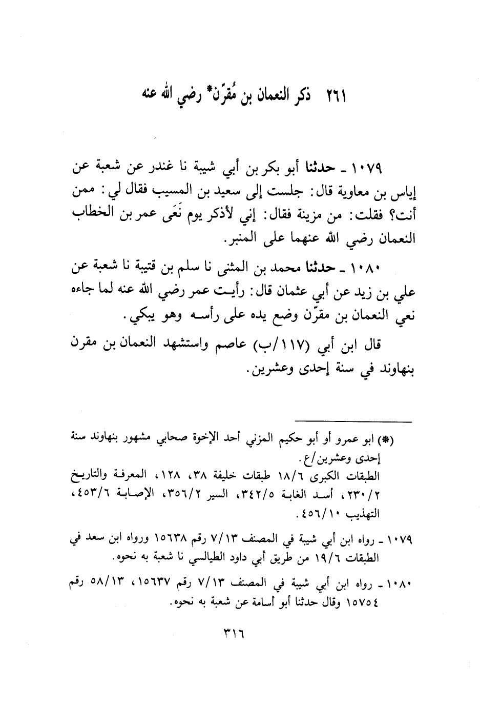 1080 - حَدَّثَنَا مُحَمَّدُ بْنُ الْمُثَنَّى، نا سَلْمُ بْنُ قُتَيْبَةَ، نا شُعْبَةُ، عَنْ عَلِيِّ بْنِ زَيْدٍ، عَنْ أَبِي عُثْمَانَ قَالَ: رَأَيْتُ عُمَرَ رَضِيَ اللَّهُ عَنْهُ لَمَّا «§جَاءَهُ نَعْيُ النُّعْمَانِ بْنِ مُقَرِّنٍ وَضْعَ يَدَهُ عَلَى رَأْسِهِ وَهُوَ يَبْكِي» ، قَالَ ابْنُ أَبِي عَاصِمٍ: وَاسْتُشْهِدَ النُّعْمَانُ بْنُ مُقَرِّنٍ بِنَهَاوَنْدَ فِي سَنَةِ إِحْدَى وَعِشْرِينَ، وَمِمَّا أَسْنَدَ
