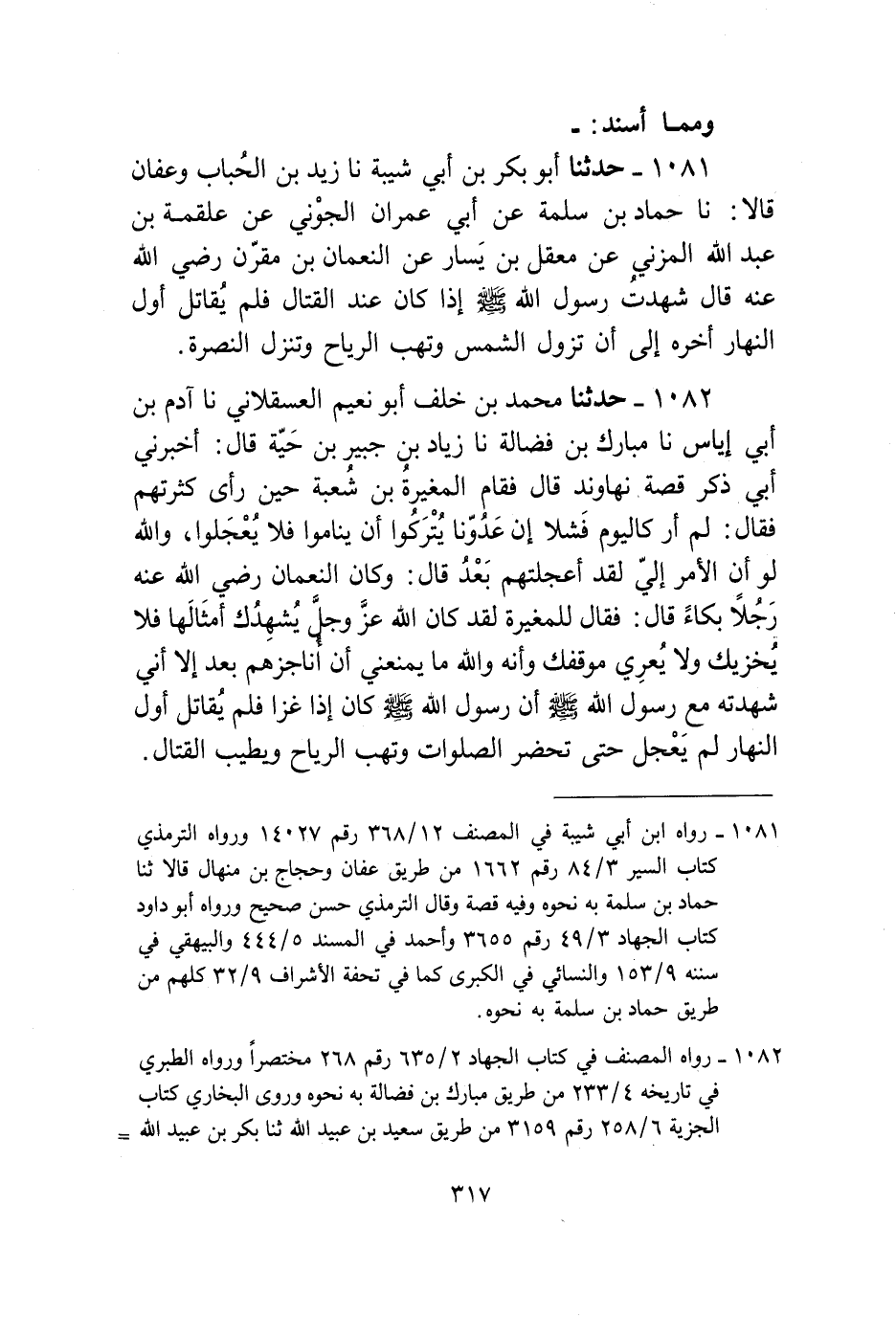 1081 - حَدَّثَنَا أَبُو بَكْرِ بْنُ أَبِي شَيْبَةَ، نا زَيْدُ بْنُ الْحُبَابِ، وَعَفَّانُ، قَالَا: نا حَمَّادُ بْنُ سَلَمَةَ، عَنْ أَبِي عِمْرَانَ الْجَوْنِيِّ، عَنْ عَلْقَمَةَ بْنِ عَبْدِ اللَّهِ الْمُزَنِيِّ، عَنْ مَعْقِلِ بْنِ يَسَارٍ، عَنِ النُّعْمَانِ بْنِ مُقَرِّنٍ رَضِيَ اللَّهُ عَنْهُ قَالَ: «شَهِدْتُ رَسُولَ اللَّهِ صَلَّى اللهُ عَلَيْهِ وَسَلَّمَ §إِذَا كَانَ عِنْدَ الْقِتَالِ فَلَمْ يُقَاتِلْ أَوَّلَ النَّهَارِ أَخَّرَهُ إِلَى أَنْ تَزُولَ الشَّمْسُ، وَتَهُبَّ الرِّيَاحُ، وَتَنْزِلَ النُّصْرَةُ»