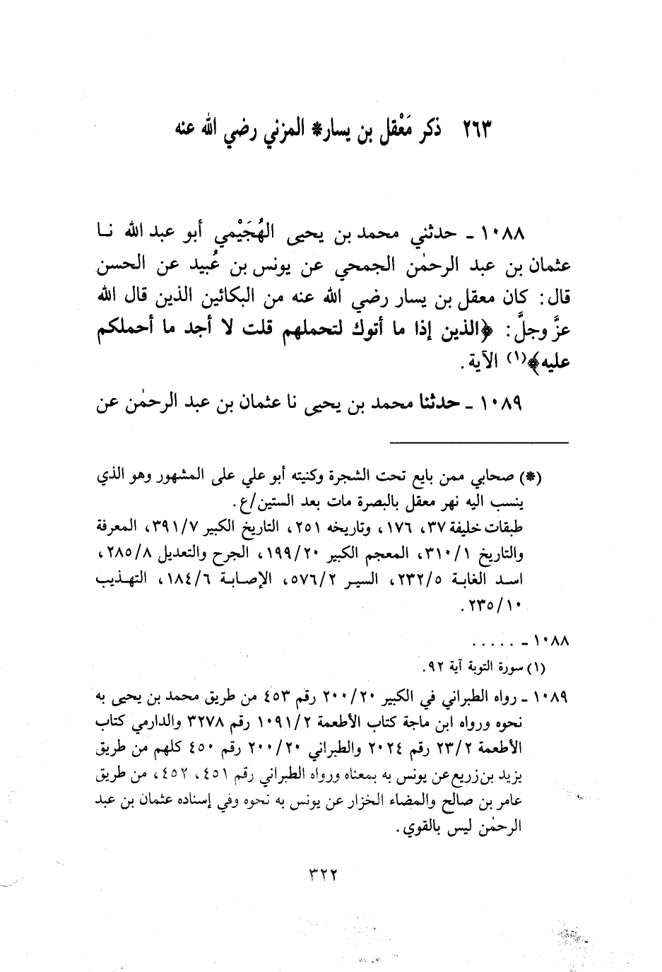 1088 - حَدَّثَنَي مُحَمَّدُ بْنُ يَحْيَى الْهُجَيْمِيُّ أَبُو عَبْدِ اللَّهِ، نا عُثْمَانُ بْنُ عَبْدِ الرَّحْمَنِ الْجُمَحِيُّ، عَنْ يُونُسَ بْنِ عُبَيْدٍ، عَنِ الْحَسَنِ قَالَ: كَانَ مَعْقِلُ بْنُ يَسَارٍ رَضِيَ اللَّهُ عَنْهُ " §مِنَ الْبَكَّائِينَ الَّذِينَ قَالَ اللَّهُ عَزَّ وَجَلَّ: {الَّذِينَ إِذَا مَا أَتَوْكَ لِتَحْمِلَهُمْ قُلْتَ لَا أَجِدُ مَا أَحْمِلُكُمْ عَلَيْهِ} [التوبة: 92] الْآيَةَ "