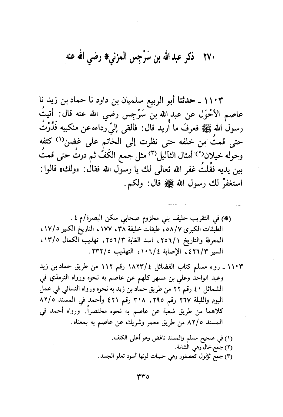 1103 - حَدَّثَنَا أَبُو الرَّبِيعِ سُلَيْمَانُ بْنُ دَاوُدَ، نا حَمَّادُ بْنُ زَيْدٍ، نا عَاصِمٌ الْأَحْوَلُ، عَنْ عَبْدِ اللَّهِ بْنِ سَرْجِسٍ رَضِيَ اللَّهُ عَنْهُ قَالَ: أَتَيْتُ رَسُولَ اللَّهِ صَلَّى اللهُ عَلَيْهِ وَسَلَّمَ فَعَرَفَ مَا أُرِيدُ، قَالَ: §فَأَلْقَى إِلَيَّ رِدَاءَهُ عَنْ مَنْكِبَيْهِ، فَدُرْتُ حَتَّى قُمْتُ مِنْ خَلْفِهِ حَتَّى نَظَرْتُ إِلَى الْخَاتَمِ عَلَى غَضْنِ كَتِفِهِ، وَحَوْلَهُ خِيلَانٌ أَمْثَالُ الثَّآلِيلِ مِثْلُ جَمْعِ الْكَفِّ، ثُمَّ دُرْتُ حَتَّى قُمْتُ بَيْنَ يَدَيْهِ فَقُلْتُ: غَفَرَ اللَّهُ تَعَالَى لَكَ يَا رَسُولَ اللَّهِ، فَقَالَ: «وَلَكَ» ، قَالُوا: اسْتَغْفَرَ لَكَ رَسُولُ اللَّهِ صَلَّى اللهُ عَلَيْهِ وَسَلَّمَ؟ قَالَ: وَلَكُمْ