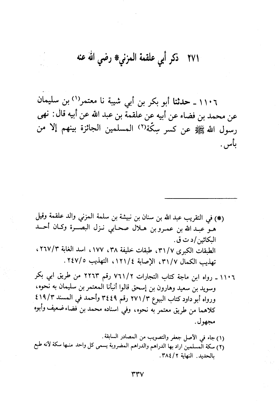 1106 - حَدَّثَنَا أَبُو بَكْرِ بْنُ أَبِي شَيْبَةَ، نا مُعْتَمِرُ بْنُ سُلَيْمَانَ، عَنْ مُحَمَّدِ بْنِ فَضَاءٍ، عَنْ أَبِيهِ، عَنْ عَلْقَمَةَ بْنِ عَبْدِ اللَّهِ، عَنْ أَبِيهِ قَالَ: «§نَهَى رَسُولُ اللَّهِ صَلَّى اللهُ عَلَيْهِ وَسَلَّمَ عَنْ كَسْرِ سِكَّةِ الْمُسْلِمِينَ الْجَائِزَةِ بَيْنَهُمْ إِلَّا مِنْ بَأْسٍ»