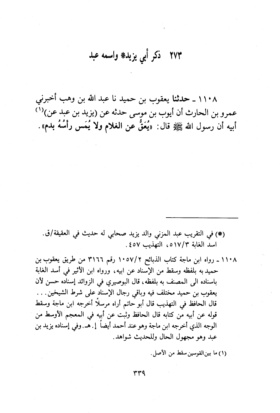 1108 - حَدَّثَنَا يَعْقُوبُ بْنُ حُمَيْدٍ، نا عَبْدُ اللَّهِ بْنُ وَهْبٍ، أَخْبَرَنِي عَمْرُو بْنُ الْحَارِثِ أَنَّ أَيُّوبَ بْنَ مُوسَى حَدَّثَهُ، عَنْ يَزِيدَ بْنِ عَبْدٍ، عَنْ أَبِيهِ، أَنَّ رَسُولَ اللَّهِ صَلَّى اللهُ عَلَيْهِ وَسَلَّمَ قَالَ: «§يُعَقُّ عَنِ الْغُلَامِ وَلَا يُمَسَّ رَأْسُهُ بِدَمٍ»