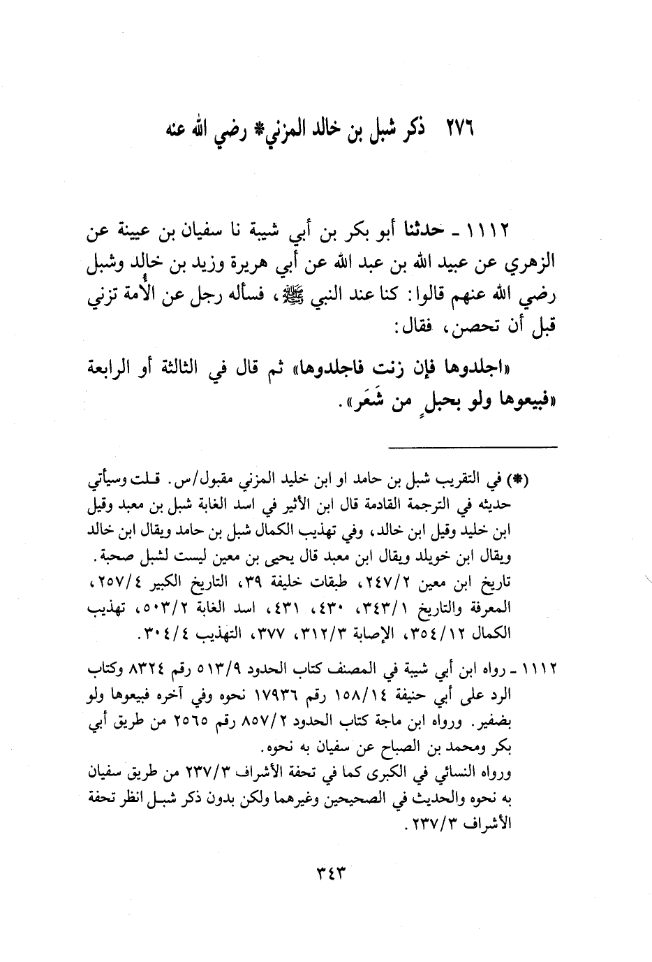 1112 - حَدَّثَنَا أَبُو بَكْرِ بْنُ أَبِي شَيْبَةَ، نا سُفْيَانُ بْنُ عُيَيْنَةَ، عَنِ الزُّهْرِيِّ، عَنْ عُبَيْدِ اللَّهِ بْنِ عَبْدِ اللَّهِ، عَنْ أَبِي هُرَيْرَةَ، وَزِيدِ بْنِ خَالِدٍ، وَشِبْلٍ رَضِيَ اللَّهُ عَنْهُمْ قَالُوا: كُنَّا عِنْدَ النَّبِيِّ صَلَّى اللهُ عَلَيْهِ وَسَلَّمَ فَسَأَلَهُ عَنِ الْأَمَةِ تَزْنِي قَبْلَ أَنْ تُحْصِنَ، فَقَالَ: «§اجْلِدُوهَا، فَإِنْ زَنَتْ فَاجْلِدُوهَا» ، ثُمَّ قَالَ فِي الثَّالِثَةِ أَوِ الرَّابِعَةِ: «فَبِيعُوهَا وَلَوْ بِحَبْلٍ مِنْ شَعَرٍ»