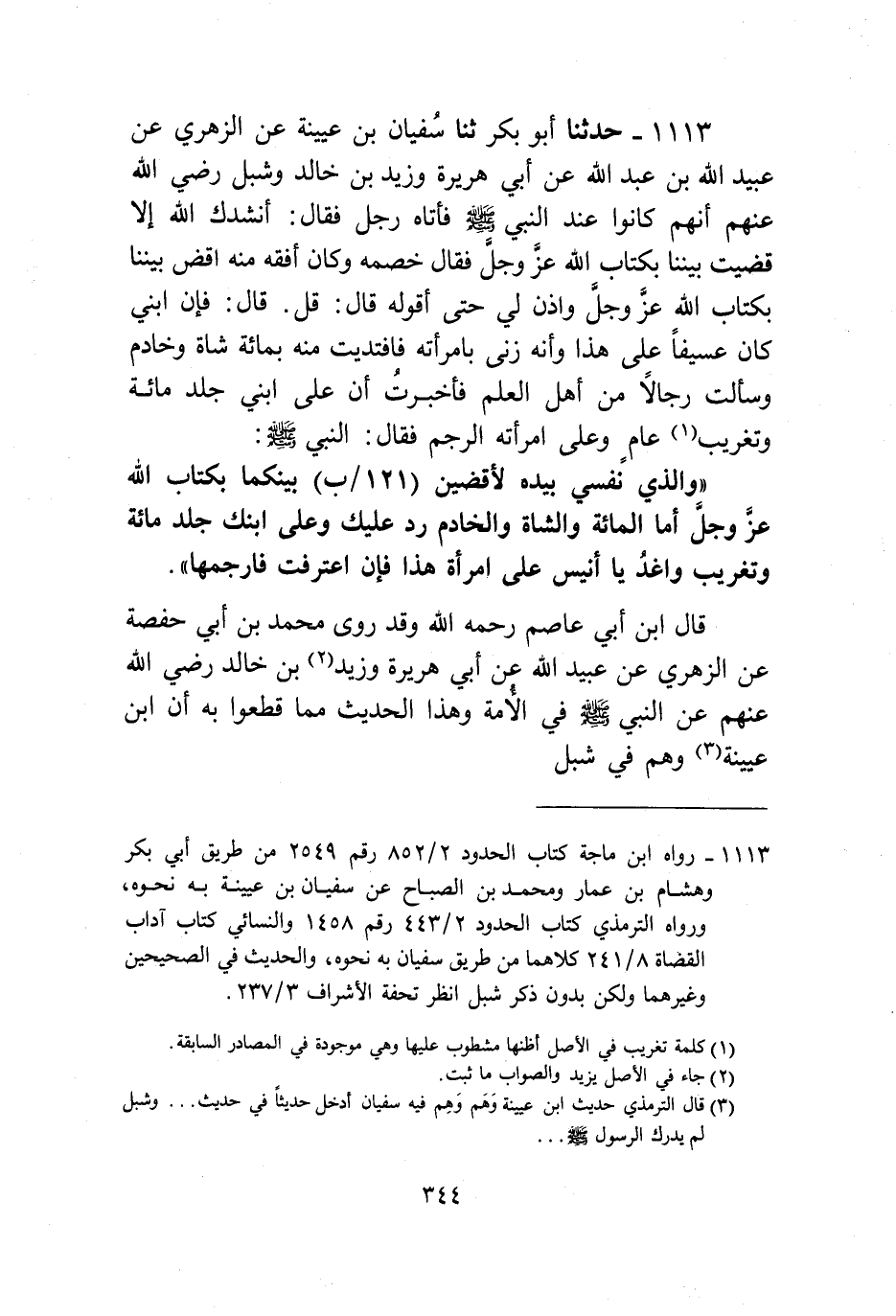 1113 - حَدَّثَنَا أَبُو بَكْرٍ، ثنا سُفْيَانُ بْنُ عُيَيْنَةَ، عَنِ الزُّهْرِيِّ، عَنْ عُبَيْدِ اللَّهِ بْنِ عَبْدِ اللَّهِ، عَنْ أَبِي هُرَيْرَةَ، وَزِيدِ بْنِ خَالِدٍ، وَشِبْلٍ رَضِيَ اللَّهُ عَنْهُمْ أَنَّهُمْ كَانُوا عِنْدَ النَّبِيِّ صَلَّى اللهُ عَلَيْهِ وَسَلَّمَ فَأَتَاهُ رَجُلٌ فَقَالَ: أَنْشُدُكَ اللَّهَ إِلَّا قَضَيْتَ بَيْنَنَا بِكِتَابِ اللَّهِ عَزَّ وَجَلَّ، فَقَالَ خَصْمُهُ ـ وَكَانَ أَفْقَهْ مِنْهُ ـ: اقْضِ بَيْنَنَا بِكِتَابِ اللَّهِ عَزَّ وَجَلَّ وَأْذَنْ لِي حَتَّى أَقَولَهُ، قَالَ: «قُلْ» ، قَالَ: فَإِنَّ ابْنِي كَانَ عَسِيفًا عَلَى هَذَا، وَإِنَّهُ زَنَى بِامْرَأَتِهِ فَافْتَدَيْتُ مِنْهُ بِمِائَةِ شَاةٍ وَخَادِمٍ، وَسَأَلْتُ رِجَالًا مِنْ أَهْلِ الْعِلْمِ فَأُخْبِرْتُ أَنَّ عَلَى ابْنِي جَلْدُ مِائَةٍ، وَتَغْرِيبُ عَامٍ، وَعَلَى امْرَأَتِهِ الرَّجْمُ، فَقَالَ النَّبِيُّ صَلَّى اللهُ عَلَيْهِ وَسَلَّمَ: «وَالَّذِي نَفْسِي بِيَدِهِ §لَأَقْضِيَّنَّ بَيْنَكُمَا بِكِتَابِ اللَّهِ عَزَّ وَجَلَّ، أَمَّا الْمِائَةُ وَالشَّاةُ وَالْخَادِمُ رَدٌّ عَلَيْكَ، وَعَلَى ابْنِكَ جَلْدُ مِائَةٍ، وَتَغْرِيبٌ، وَاغْدُ يَا أُنَيْسُ عَلَى امْرَأَةِ هَذَا فَإِنِ اعْتَرَفَتْ فَارْجُمْهَا» ، قَالَ ابْنُ أَبِي عَاصِمٍ رَحِمَهُ اللَّهُ: وَقَدْ رَوَى مُحَمَّدُ بْنُ أَبِي حَفْصَةَ، عَنِ الزُّهْرِيِّ، عَنْ عُبَيْدِ اللَّهِ، عَنْ أَبِي هُرَيْرَةَ، وَزِيدِ بْنِ خَالِدٍ رَضِيَ اللَّهُ عَنْهُمْ، عَنِ النَّبِيِّ صَلَّى اللهُ عَلَيْهِ وَسَلَّمَ فِي الْأَمَةِ، وَهَذَا الْحَدِيثُ مِمَّا قَطَعُوا بِهِ أَنَّ ابْنَ عُيَيْنَةَ وَهِمَ فِي شِبْلٍ