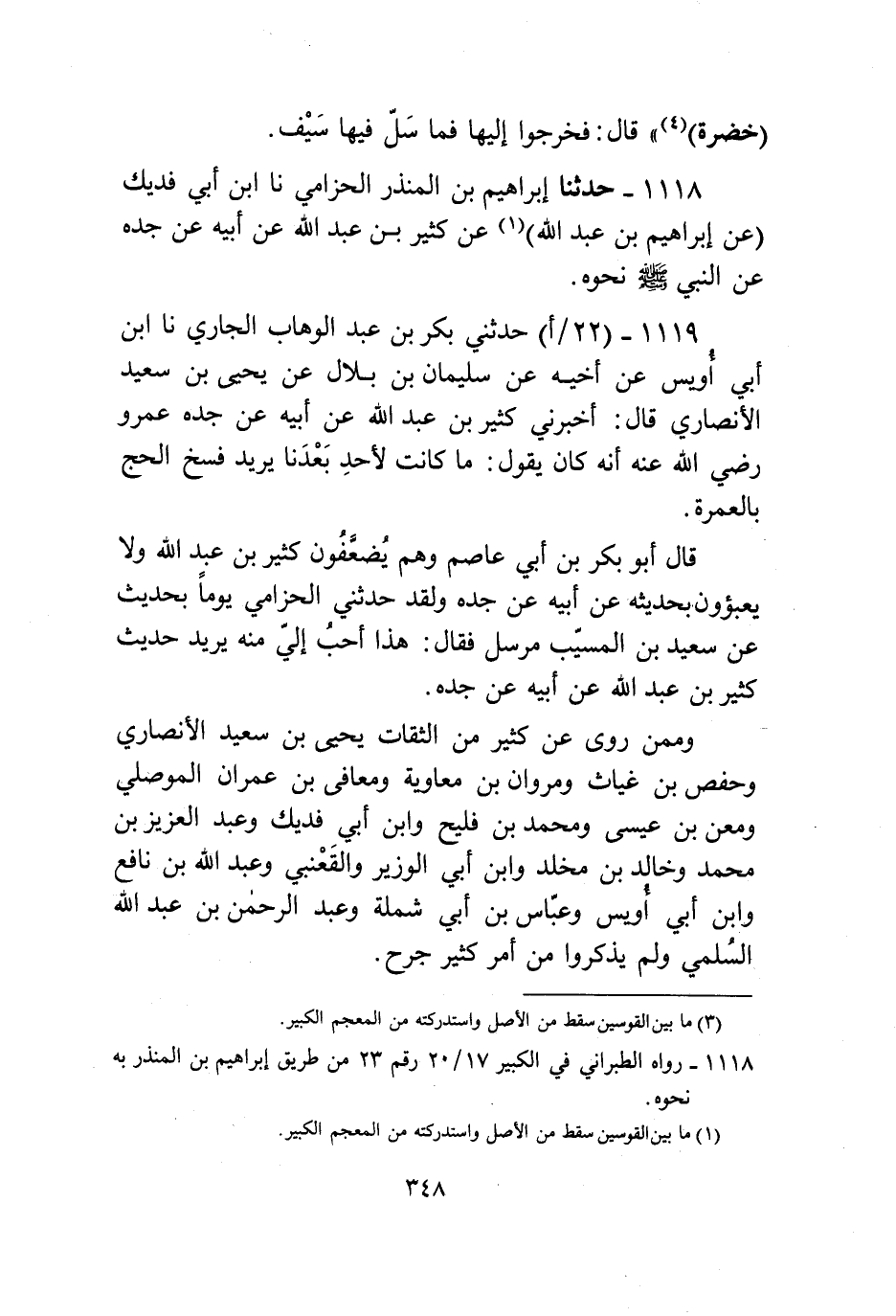 1119 - حَدَّثَنِي بَكْرُ بْنُ عَبْدِ الْوَهَّابِ الْجَارِيُّ، نا ابْنُ أَبِي أُوَيْسٍ، عَنْ أَخِيهِ، عَنْ سُلَيْمَانَ بْنِ بِلَالٍ، عَنْ يَحْيَى بْنِ سَعِيدٍ الْأَنْصَارِيِّ قَالَ: أَخْبَرَنِي كَثِيرُ بْنُ عَبْدِ اللَّهِ، عَنْ أَبِيهِ، عَنْ جَدِّهِ عَمْرٍو رَضِيَ اللَّهُ عَنْهُ أَنَّهُ كَانَ يَقُولُ: «§مَا كَانَتْ لِأَحَدٍ بَعْدَنَا» ، يُرِيدُ فَسْخَ الْحَجِّ بِالْعُمْرَةِ قَالَ أَبُو بَكْرِ بْنُ أَبِي عَاصِمٍ: وَهُمْ يُضَعِّفُونَ كَثِيرَ بْنَ عَبْدِ اللَّهِ، وَلَا يَعْبَؤُونَ بِحَدِيثِهِ عَنْ أَبِيهِ، عَنْ جَدِّهِ، وَلَقَدْ حَدَّثَنِي الْحِزَامِيُّ يَوْمًا بِحَدِيثٍ، عَنْ سَعِيدِ بْنِ الْمُسَيِّبِ مُرْسَلًا فَقَالَ: هَذَا أَحَبُّ إِلَيَّ مِنْهُ، يُرِيدُ: حَدِيثَ كَثِيرِ بْنِ عَبْدِ اللَّهِ، عَنْ أَبِيهِ، عَنْ جَدِّهِ، وَمِمَّنْ رَوَى عَنْ كَثِيرٍ مِنَ الثِّقَاتِ: يَحْيَى بْنُ سَعِيدٍ الْأَنْصَارِيُّ، وَحَفْصُ بْنُ غِيَاثٍ، وَمَرْوَانُ بْنُ مُعَاوِيَةَ، وَمُعَافَى بْنُ عِمْرَانَ الْمُوصِلِيُّ، وَمَعْنُ بْنُ عِيسَى، وَمُحَمَّدُ بْنُ فُلَيْحٍ، وَابْنُ أَبِي فُدَيْكٍ، وَعَبْدُ الْعَزِيزِ بْنُ مُحَمَّدٍ، وَخَالِدُ بْنُ مَخْلَدٍ، وَابْنُ أَبِي الْوَزِيرِ، وَالْقَعْنَبِيُّ، وَعَبْدُ اللَّهِ بْنُ نَافِعٍ، وَابْنُ أَبِي أُوَيْسٍ، وَعَبَّاسُ بْنُ أَبِي شَمْلَةَ، وَعَبْدُ الرَّحْمَنِ بْنُ عَبْدِ اللَّهِ السُّلَمِيُّ، وَلَمْ يَذْكُرُوا مِنْ أَمْرِ كَثِيرٍ جَرْحًا