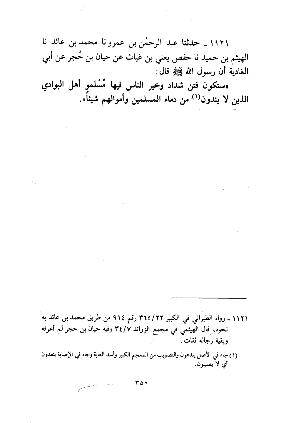 1121 - حَدَّثَنَا عَبْدُ الرَّحْمَنِ بْنُ عَمْرٍو، نا مُحَمَّدُ بْنُ عَائِذٍ، نا الْهَيْثَمُ بْنُ حُمَيْدٍ، نا حَفْصٌ يَعْنِي ابْنَ غِيَاثٍ، عَنْ حَيَّانَ بْنِ حُجْرٍ، عَنْ أَبِي الْغَادِيَةِ، أَنَّ رَسُولَ اللَّهِ صَلَّى اللهُ عَلَيْهِ وَسَلَّمَ قَالَ: «§سَتَكُونُ فِتَنٌ شِدَادٌ، وَخَيْرُ النَّاسِ فِيهَا مُسْلِمُو أَهْلِ الْبَوَادِي الَّذِينَ لَا يَنْدُونَ مِنْ دِمَاءِ الْمُسْلِمِينَ وَأَمْوَالِهِمْ شَيْئًا»