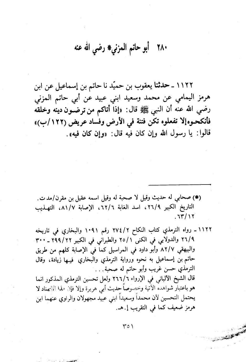 1122 - حَدَّثَنَا يَعْقُوبُ بْنُ حُمَيْدٍ، نا حَاتِمُ بْنُ إِسْمَاعِيلَ، عَنِ ابْنِ هُرْمُزَ الْيَمَامِيِّ، عَنْ مُحَمَّدٍ، وَسَعِيدٍ، ابْنِي عُبَيْدٍ، عَنْ أَبِي حَاتِمٍ الْمُزَنِيِّ رَضِيَ اللَّهُ عَنْهُ، أَنَّ النَّبِيَّ صَلَّى اللهُ عَلَيْهِ وَسَلَّمَ قَالَ: «§إِذَا أَتَاكُمْ مَنْ تَرْضَوْنَ دِينَهُ وَخُلُقَهُ فَأَنْكِحُوهُ، إِلَّا تَفْعَلُوهُ تَكُنْ فِتْنَةٌ فِي الْأَرْضِ وَفَسَادٌ عَرِيضٌ» ، قَالُوا: يَا رَسُولَ اللَّهِ، وَإِنْ كَانَ فِيهِ؟ قَالَ: «وَإِنْ كَانَ فِيهِ»