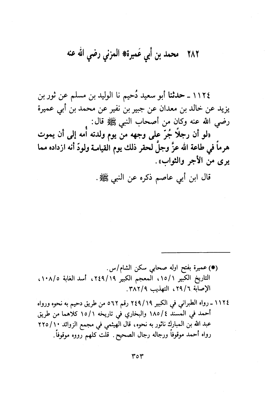 1124 - حَدَّثَنَا أَبُو سَعِيدٍ دُحَيْمٌ، نا الْوَلِيدُ بْنُ مُسْلِمٍ، عَنْ ثَوْرِ بْنِ يَزِيدَ، عَنْ خَالِدِ بْنِ مَعْدَانَ، عَنْ جُبَيْرِ بْنِ نُفَيْرٍ، عَنْ مُحَمَّدِ بْنِ أَبِي عَمِيرَةَ رَضِيَ اللَّهُ عَنْهُ وَكَانَ مِنْ أَصْحَابِ النَّبِيِّ صَلَّى اللهُ عَلَيْهِ وَسَلَّمَ قَالَ: «§لَوْ أَنَّ رَجُلًا جُرَّ عَلَى وَجْهِهِ مِنْ يَوْمِ وَلَدَتْهُ أُمُّهُ إِلَى أَنْ يَمُوتَ هَرَمًا فِي طَاعَةِ اللَّهِ عَزَّ وَجَلَّ لَحَقَرَ ذَلِكَ يَوْمَ الْقِيَامَةِ، وَلَوَدَّ أَنَّهُ ازْدَادَهُ مِمَّا يَرَى مِنَ الْأَجْرِ وَالثَّوَابِ» ، قَالَ ابْنُ أَبَى عَاصِمٍ: ذَكَرَهُ عَنِ النَّبِيِّ صَلَّى اللهُ عَلَيْهِ وَسَلَّمَ -[354]-،