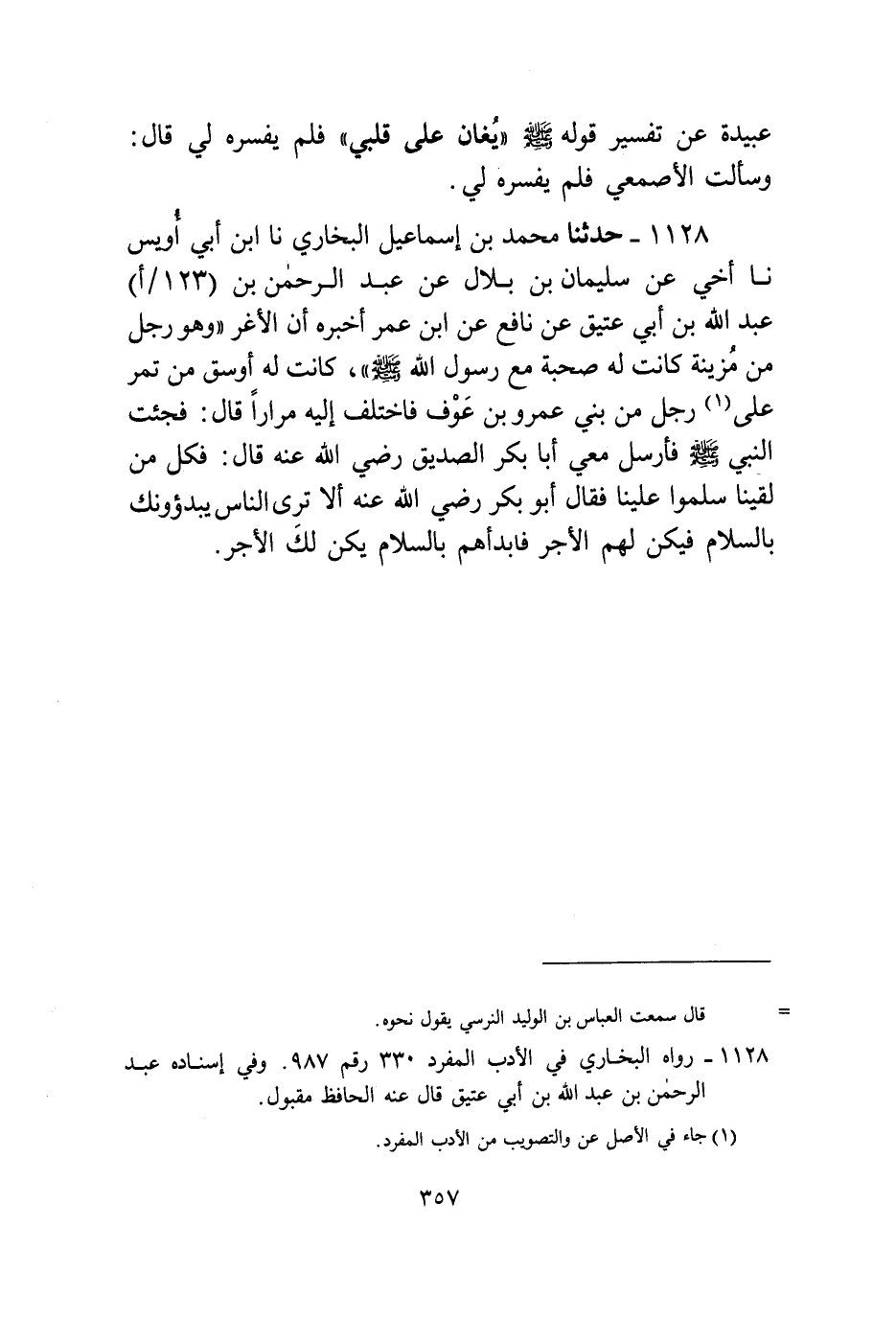 1128 - حَدَّثَنَا مُحَمَّدُ بْنُ إِسْمَاعِيلَ الْبُخَارِيُّ، نا ابْنُ أَبِي أُوَيْسٍ، نا أَخِي، عَنْ سُلَيْمَانَ بْنِ بِلَالٍ، عَنْ عَبْدِ الرَّحْمَنِ بْنِ عَبْدِ اللَّهِ بْنِ أَبِي عَتِيقٍ، عَنْ نَافِعٍ، عَنِ ابْنِ عُمَرَ أَخْبَرَهُ، " أَنَّ الْأَغَرَّ وَهُوَ رَجُلٌ مِنْ مُزَيْنَةَ كَانَتْ لَهُ صُحْبَةٌ مَعَ رَسُولِ اللَّهِ صَلَّى اللهُ عَلَيْهِ وَسَلَّمَ، كَانَتْ لَهُ أَوْسُقٌ مِنْ تَمْرٍ عَلَى رَجُلٍ مِنْ بَنِي عَمْرِو بْنِ عَوْفٍ، فَاخْتَلَفَ إِلَيْهِ مِرَارًا، قَالَ: §فَجِئْتُ النَّبِيَّ صَلَّى اللهُ عَلَيْهِ وَسَلَّمَ فَأَرْسَلَ مَعِي أَبَا بَكْرٍ الصِّدِّيقَ رَضِيَ اللَّهُ عَنْهُ، قَالَ: فَكُلُّ مَنْ لَقِينَا سَلَّمُوا عَلَيْنَا، فَقَالَ أَبُو بَكْرٍ رَضِيَ اللَّهُ عَنْهُ: أَلَا تَرَى النَّاسَ يَبْدَءُونَكَ بِالسَّلَامِ فَيَكُنْ لَهُمُ الْأَجْرُ، فَابْدَأْهُمْ بِالسَّلَامِ يَكُنْ لَكَ الْأَجْرُ