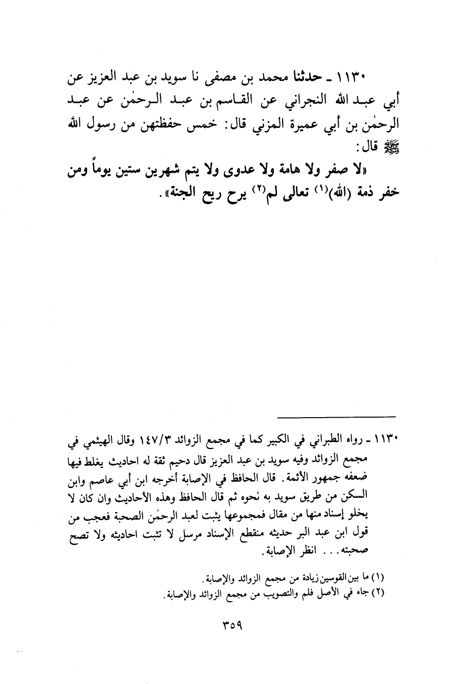 1130 - حَدَّثَنَا مُحَمَّدُ بْنُ مُصَفَّى، نا سُوَيْدُ بْنُ عَبْدِ الْعَزِيزِ، عَنْ أَبِي عَبْدِ اللَّهِ النَّجْرَانِيِّ، عَنِ الْقَاسِمِ بْنِ عَبْدِ الرَّحْمَنِ، عَنْ عَبْدِ الرَّحْمَنِ بْنِ أَبِي عَمِيرَةَ الْمُزَنِيِّ قَالَ: خَمْسٌ حَفِظْتُهُنَّ مِنْ رَسُولِ اللَّهِ صَلَّى اللهُ عَلَيْهِ وَسَلَّمَ قَالَ: «§لَا صَفَرَ، وَلَا هَامَةَ، وَلَا عَدْوَى، وَلَا يَتِمُّ شَهْرَانِ سِتِّينَ يَوْمًا، وَمَنْ خَفَرَ ذِمَّةَ اللَّهِ تَعَالَى لَمْ يَرَحْ رِيحَ الْجَنَّةِ»