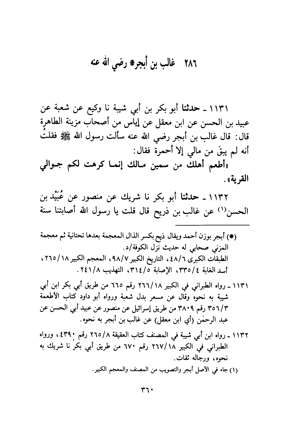 1131 - حَدَّثَنَا أَبُو بَكْرِ بْنُ أَبَى شَيْبَةَ، نا وَكِيعٌ، عَنْ شُعْبَةَ، عَنْ عُبَيْدِ بْنِ الْحَسَنِ، عَنِ ابْنِ مَعْقِلٍ، عَنْ أُنَاسٍ مِنْ أَصْحَابِ مُزَيْنَةَ الطَّاهِرَةِ قَالَ: قَالَ غَالِبُ بْنُ أَبْجَرَ رَضِيَ اللَّهُ عَنْهُ: سَأَلْتُ رَسُولَ اللَّهِ صَلَّى اللهُ عَلَيْهِ وَسَلَّمَ فَقُلْتُ: إِنَّهُ لَمْ يَبْقَ مِنْ مَالِي أَلَا أَحْمِرَةٌ، فَقَالَ: «§أَطْعِمْ أَهْلَكَ مِنْ سَمِينِ مَالِكَ، إِنَّمَا كَرِهْتُ لَكُمْ جَوَالِّ الْقَرْيَةِ»