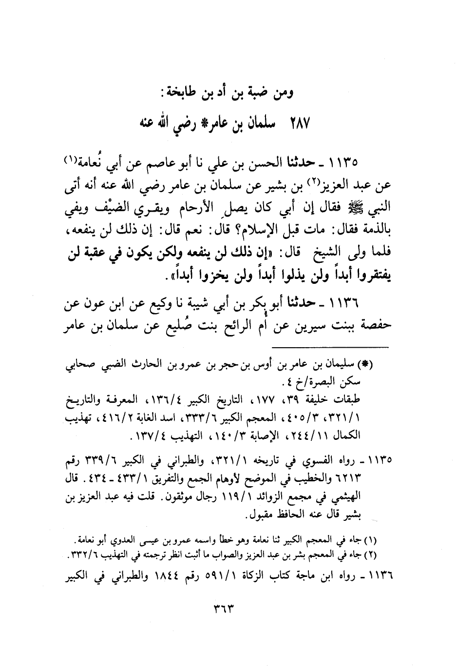 1135 - حَدَّثَنَا الْحَسَنُ بْنُ عَلِيٍّ، نا أَبُو عَاصِمٍ، عَنْ أَبِي نَعَامَةَ، عَنْ عَبْدِ الْعَزِيزِ بْنِ بَشِيرٍ، عَنْ سَلْمَانَ بْنِ عَامِرٍ رَضِيَ اللَّهُ عَنْهُ، أَنَّهُ أَتَى النَّبِيَّ صَلَّى اللهُ عَلَيْهِ وَسَلَّمَ فَقَالَ: إِنَّ أَبِي كَانَ يَصِلُ الْأَرْحَامَ، وَيَقْرِي الضَّيْفَ، وَيَفِي بِالذِّمَّةِ، فَقَالَ: «مَاتَ قَبْلَ الْإِسْلَامِ؟» ، قَالَ: نَعَمْ، قَالَ: «إِنَّ ذَلِكَ لَنْ يَنْفَعُهُ» ، فَلَمَّا وَلَّى الشَّيْخُ قَالَ: " §إِنَّ ذَلِكَ لَنْ يَنْفَعُهُ، وَلَكِنْ يَكُونُ فِي عَقِبِهِ: لَنْ يَفْتَقِرُوا أَبَدًا، وَلَنْ يَذِلُّوا أَبَدًا، وَلَنْ يُخْزَوْا أَبَدًا "