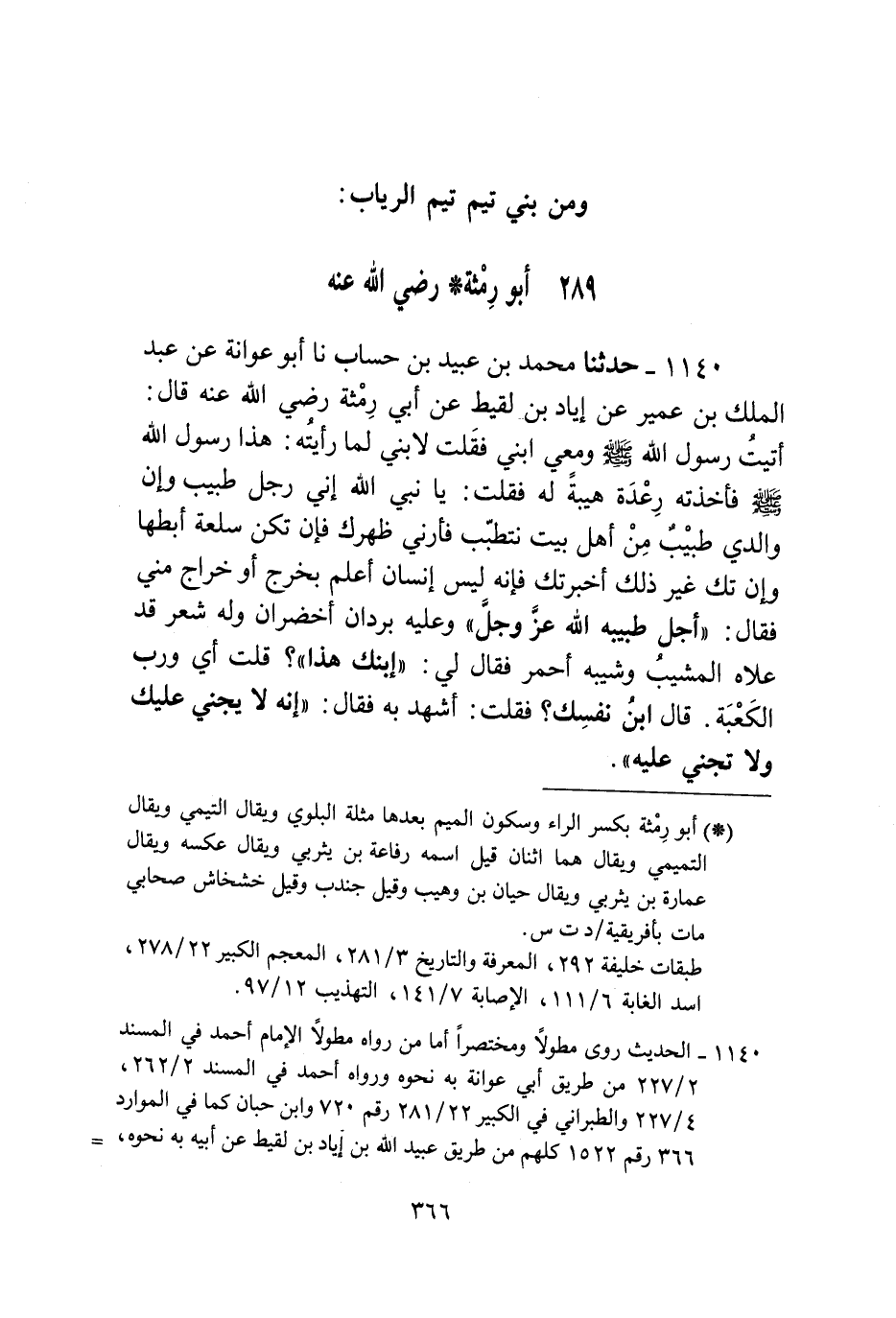 1140 - حَدَّثَنَا مُحَمَّدُ بْنُ عُبَيْدِ بْنِ حِسَابٍ، نا أَبُو عَوَانَةَ، عَنْ عَبْدِ الْمَلِكِ بْنِ عُمَيْرٍ، عَنْ إِيَادِ بْنِ لَقِيطٍ، عَنْ أَبِي رِمْثَةَ رَضِيَ اللَّهُ عَنْهُ قَالَ: أَتَيْتُ رَسُولَ اللَّهِ صَلَّى اللهُ عَلَيْهِ وَسَلَّمَ وَمَعِي ابْنَىْ، فَقُلْتُ لِابْنِي لَمَّا رَأَيْتُهُ: هَذَا رَسُولُ اللَّهِ صَلَّى اللهُ عَلَيْهِ وَسَلَّمَ، فَأَخَذْتُهُ رِعْدَةٌ هَيْبَةً لَهُ، فَقُلْتُ: يَا نَبِيَّ اللَّهِ، إِنَّى رَجُلٌ طَبِيبٌ، وَإِنَّ وَالِدِي طَبِيبٌ مِنْ أَهْلِ بَيْتٍ نَتَطَبَّبُ، فَأَرِنِي ظَهْرَكَ، فَإِنْ تَكُنْ سَلْعَةٌ أَبُطُّهَا، وَإِنْ تَكُ غَيْرَ ذَلِكَ أَخْبَرْتُكَ، فَإِنَّهُ لَيْسَ إِنْسَانٌ أَعْلَمَ بِخُرْجٍ أَوْ خُرَّاجٍ مِنِّي، فَقَالَ: «أَجَلْ، طَبِيبُهُ اللَّهُ عَزَّ وَجَلَّ» ، وَعَلَيْهِ بُرْدَانِ أَخْضَرَانِ وَلَهُ شَعْرٌ قَدْ عَلَاهُ الْمَشِيبُ وَشَيْبُهُ أَحْمَرُ، فَقَالَ لِيَ: «ابْنُكَ هَذَا؟» ، قُلْتُ: إِي وَرَبِّ الْكَعْبَةِ، قَالَ: ابْنُ نَفْسِكَ؟ "، فَقُلْتُ: أَشْهَدُ بِهِ، فَقَالَ: «§إِنَّهُ لَا يَجْنِي عَلَيْكَ، وَلَا تَجْنِي عَلَيْهِ»
