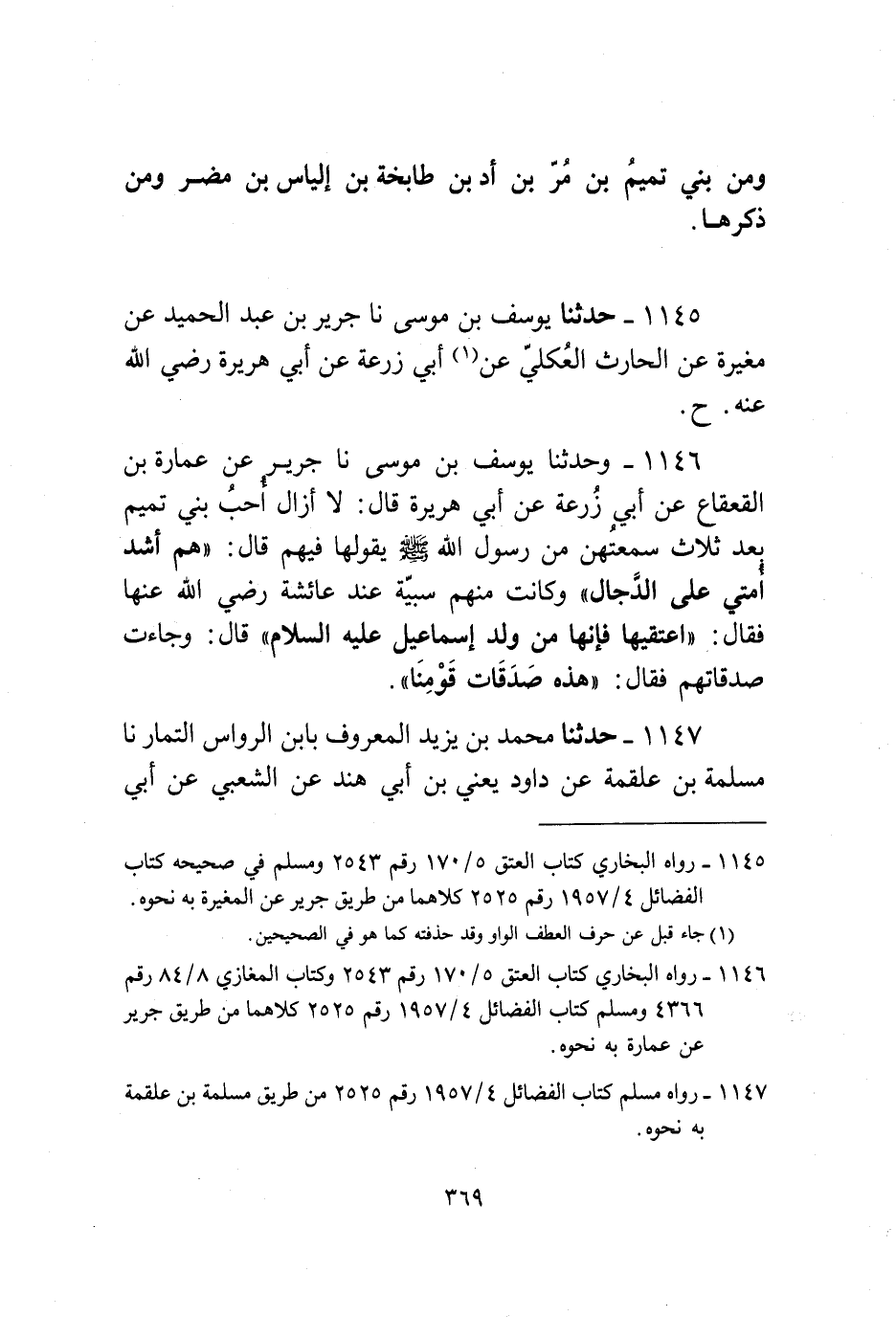 1146 - وَحَدَّثَنَا يُوسُفُ بْنُ مُوسَى، نا جَرِيرٌ، عَنْ عُمَارَةَ بْنِ الْقَعْقَاعِ، عَنْ أَبِي زُرْعَةَ، عَنْ أَبِي هُرَيْرَةَ قَالَ: لَا أَزَالُ أُحِبُّ بَنِي تَمِيمٍ بَعْدَ ثَلَاثٍ سَمِعْتُهُنَّ مِنْ رَسُولِ اللَّهِ صَلَّى اللهُ عَلَيْهِ وَسَلَّمَ يَقُولُهَا فِيهِمْ، قَالَ: «§هُمْ أَشَدُّ أُمَّتِي عَلَى الدَّجَّالِ» ، وَكَانَتْ مِنْهُمْ سَبِيَّةٌ عِنْدَ عَائِشَةَ رَضِيَ اللَّهُ عَنْهَا، فَقَالَ: «أَعْتِقِيهَا فَإِنَّهَا مِنْ وَلَدِ إِسْمَاعِيلَ عَلَيْهِ السَّلَامُ» ، قَالَ: وَجَاءَتْ صَدَقَاتُهُمْ فَقَالَ: «هَذِهِ صَدَقَاتُ قَوْمِنَا»