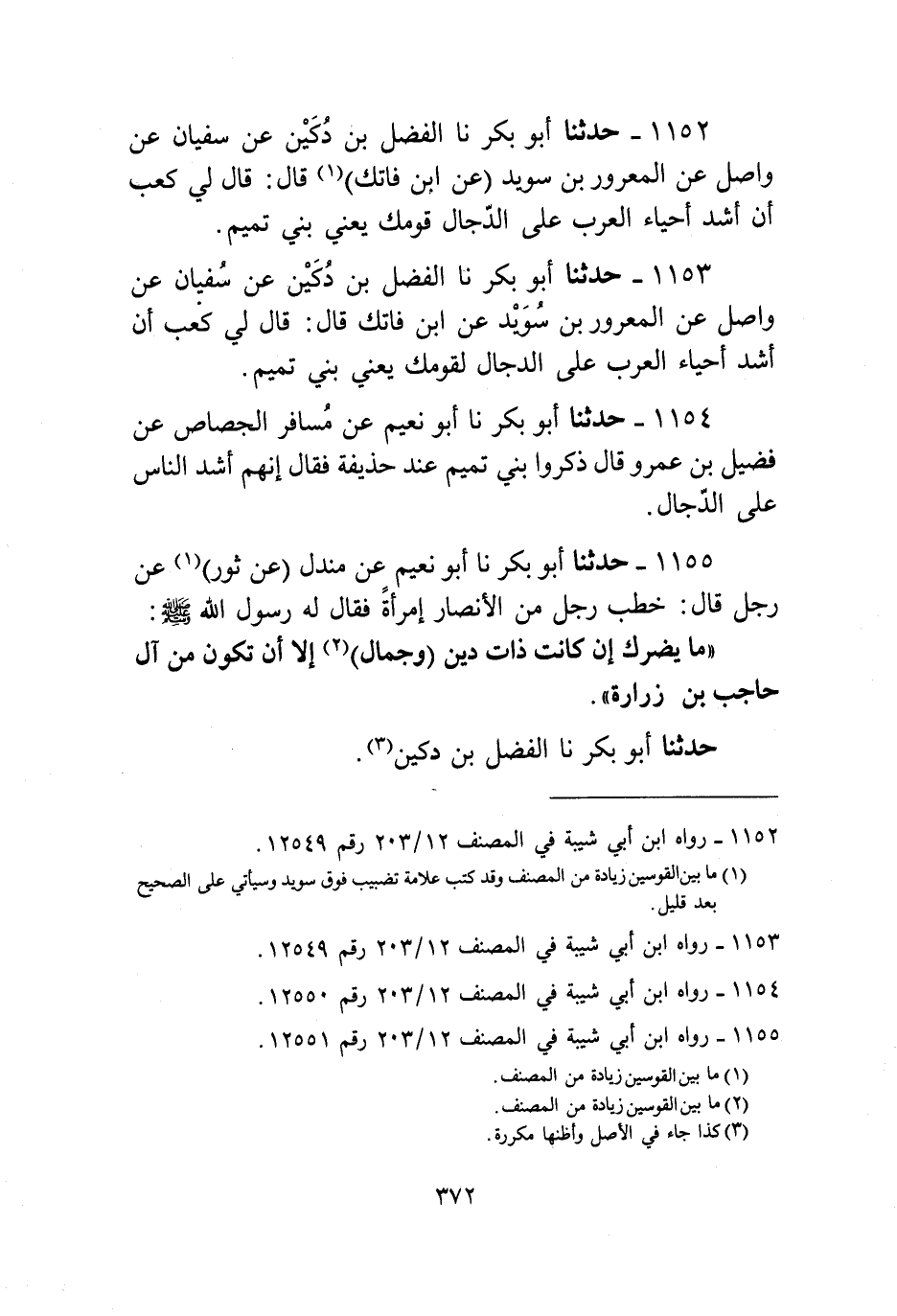 1152 - حَدَّثَنَا أَبُو بَكْرٍ، نا الْفَضْلُ بْنُ دُكَيْنٍ، عَنْ سُفْيَانَ، عَنْ وَاصِلٍ، عَنِ الْمَعْرُورِ بْنِ سُوَيْدٍ، عَنِ ابْنِ فَاتِكٍ قَالَ: قَالَ لِي كَعْبٌ: «إِنَّ §أَشَدَّ أَحْيَاءِ الْعَرَبِ عَلَى الدَّجَّالِ قَوْمُكَ» ، يَعْنِي بَنِي تَمِيمٍ