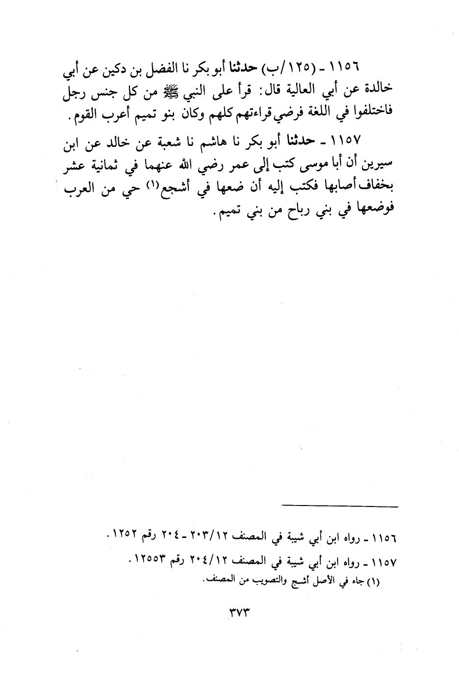 1156 - حَدَّثَنَا أَبُو بَكْرٍ، نا الْفَضْلُ بْنُ دُكَيْنٍ، عَنْ أَبِي خَلَدَةَ، عَنْ أَبِي الْعَالِيَةِ قَالَ: «§قَرَأَ عَلَى النَّبِيِّ صَلَّى اللهُ عَلَيْهِ وَسَلَّمَ مِنْ كُلِّ جِنْسٍ رَجُلٌ، فَاخْتَلَفُوا فِي اللُّغَةِ فَرَضِيَ قِرَاءَتِهِمْ كُلِّهِمْ، وَكَانَ بَنُو تَمِيمٍ أَعْرَبَ الْقَوْمِ»