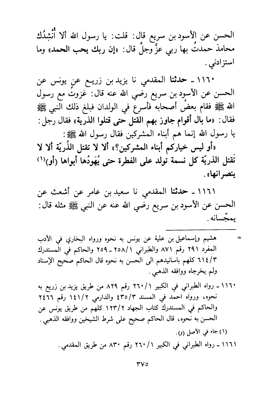 1160 - حَدَّثَنَا الْمُقَدَّمِيُّ، نا يَزِيدُ بْنُ زُرَيْعٍ، عَنْ يُونُسَ، عَنِ الْحَسَنِ، عَنِ الْأَسْوَدِ بْنِ سَرِيعٍ رَضِيَ اللَّهُ عَنْهُ قَالَ: غَزَوْتُ مَعَ رَسُولِ اللَّهِ صَلَّى اللهُ عَلَيْهِ وَسَلَّمَ فَقَامَ بَعْضُ أَصْحَابِهِ فَأَسْرَعَ فِي الْوِلْدَانِ، فَبَلَغَ ذَلِكَ النَّبِيَّ صَلَّى اللهُ عَلَيْهِ وَسَلَّمَ، فقَالَ: «مَا بَالُ أَقْوَامٍ جَاوَزَ بِهِمُ الْقَتْلَ حَتَّى قَتَلُوا الذُّرِّيَّةَ؟» ، فَقَالَ رَجُلٌ: يَا رَسُولَ اللَّهِ، إِنَّمَا هُمْ أَبْنَاءُ الْمُشْرِكِينَ، فَقَالَ رَسُولُ اللَّهِ صَلَّى اللهُ عَلَيْهِ وَسَلَّمَ: «أَوَ لَيْسَ خِيَارَكُمْ أَبْنَاءُ الْمُشْرِكِينَ؟ أَلَا §لَا تُقْتَلُ الذُّرِّيَّةُ، أَلَا لَا تُقْتَلُ الذُّرِّيَّةُ، كُلُّ نَسَمَةٍ تُولَدُ عَلَى الْفِطْرَةِ، حَتَّى يُهَوِّدُهَا أَبَوَاهَا أَوْ يُنَصِّرَانِهَا» ،