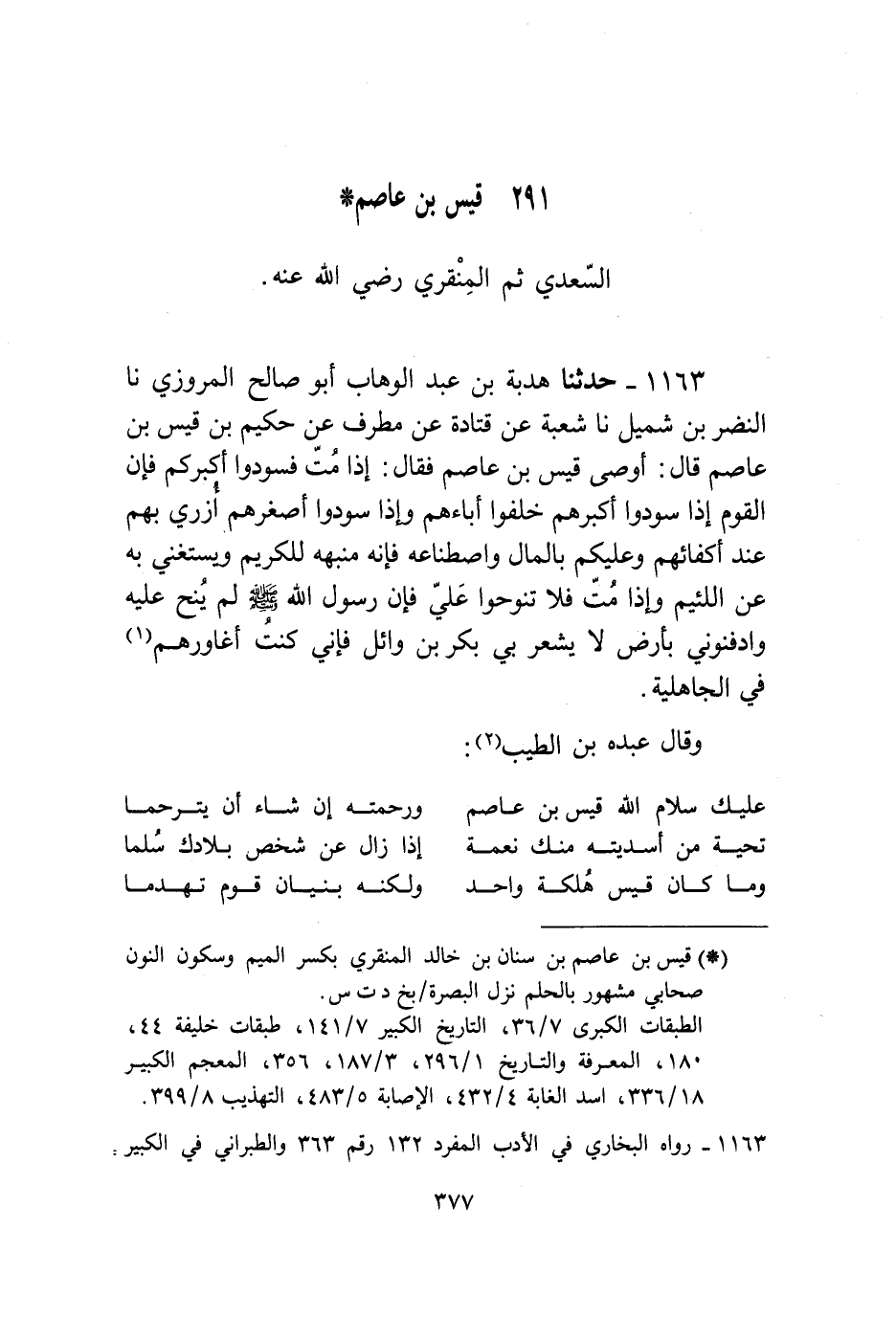 1163 - حَدَّثَنَا هَدِيَّةُ بْنُ عَبْدِ الْوَهَّابِ أَبُو صَالِحٍ الْمَرْوَزِيُّ، نا النَّضْرُ بْنُ شُمَيْلٍ، نا شُعْبَةُ، عَنْ قَتَادَةَ، عَنْ مُطَرِّفٍ، عَنْ حَكِيمِ بْنِ قَيْسِ بْنِ عَاصِمٍ قَالَ: أَوْصَى قَيْسُ بْنُ عَاصِمٍ فَقَالَ: «§إِذَا مُتُّ فَسَوِّدُوا أَكْبَرَكُمْ، فَإِنَّ الْقَوْمَ إِذَا سَوَّدُوا أَكْبَرَهُمْ خَلَفُوا أَبَاءَهُمْ، وَإِذَا سَوَّدُوا أَصْغَرَهُمْ أَزْرَى بِهِمْ عِنْدَ أَكْفَائِهِمْ، وَعَلَيْكُمْ بِالْمَالِ وَاصْطِنَاعِهِ، فَإِنَّهُ مَنْبَهَةٌ لِلْكَرِيمِ، وَيُسْتَغْنَى بِهِ عَنِ اللَّئِيمِ، وَإِذَا مُتُّ فَلَا تَنُوحُوا عَلَيَّ، فَإِنَّ رَسُولَ اللَّهِ صَلَّى اللهُ عَلَيْهِ وَسَلَّمَ لَمْ يُنَحْ عَلَيْهِ، وَادْفِنُونِي بِأَرْضٍ لَا يَشْعُرُ بِي بَكْرُ بْنُ وَائِلٍ، فَإِنِّي كُنْتُ أُغَاوِرُهُمْ فِي الْجَاهِلِيَّةِ» ، وَقَالَ عَبْدَةُ بْنُ الطَّيِّبِ: