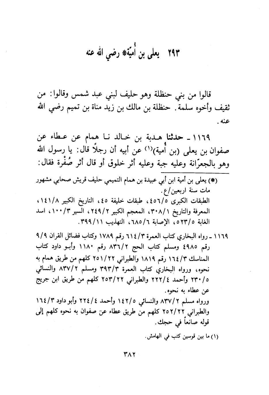1169 - حَدَّثَنَا هُدْبَةُ بْنُ خَالِدٍ، نا هَمَّامٌ، عَنْ عَطَاءٍ، عَنْ صَفْوَانَ بْنِ يَعْلَى بْنِ أُمَيَّةَ، عَنْ أَبِيهِ، أَنَّ رَجُلًا قَالَ: يَا رَسُولَ اللَّهِ، وَهُوَ بِالْجِعْرَانَةِ وَعَلَيْهِ جُبَّةٌ، وَعَلَيْهِ أَثَرُ خَلُوقٍ، أَوْ قَالَ: أَثَرُ صُفْرَةٍ، فَقَالَ: كَيْفَ تَأْمُرُنِي أَنْ أَصْنَعَ فِي عُمْرَتِي؟ قَالَ: وَنَزَلَ عَلَى النَّبِيِّ صَلَّى اللهُ عَلَيْهِ وَسَلَّمَ الْوَحْيُ فَسُتِرَ بِثَوْبٍ، وَكَانَ يَقُولُ: وَدِدْتُ أَنِّي قَدْ رَأَيْتُ رَسُولَ اللَّهِ صَلَّى اللهُ عَلَيْهِ وَسَلَّمَ يُنْزَلُ عَلَيْهِ وَقَدْ نَزَلَ عَلَيْهِ الْوَحْيُ فَقَالَ عُمَرُ: يَسُرُّكَ أَنْ تَنْظُرَ إِلَى رَسُولِ اللَّهِ صَلَّى اللهُ عَلَيْهِ وَسَلَّمَ وَقَدْ أُنْزِلَ عَلَيْهِ الْوَحْيُ؟ قُلْتُ: نَعَمْ، قَالَ: قُمْ تَحْتَ طَرَفِ الثَّوْبِ وَهُوَ يَغِطُّ، أَحْسِبُهُ قَالَ: كَغَطِيطِ الْبَكْرِ، قَالَ: فَلَمَّا سُرِّيَ عَنْهُ قَالَ: «أَيْنَ السَّائِلُ عَنِ الْعُمْرَةِ؟ اخْلَعْ عَنْكَ الْجُبَّةَ وَاغْسِلْ عَنْكَ أَثَرَ الْخَلُوقِ» ، أَوْ قَالَ: «الصُّفْرَةِ، §وَاصْنَعْ فِي عُمْرَتِكَ مَا كُنْتَ صَانِعًا فِي حَجِّكَ» ، وَكَانَ رَجُلٌ قَدْ عَضَّ يَدَ رَجُلٍ آخَرَ فَنَزَعَ ثَنِيَّتَهُ فَسَقَطَتْ ثَنِيَّةُ الَّذِي عَضَّهُ، فَأَبْطَلَهَا رَسُولُ اللَّهِ صَلَّى اللهُ عَلَيْهِ وَسَلَّمَ