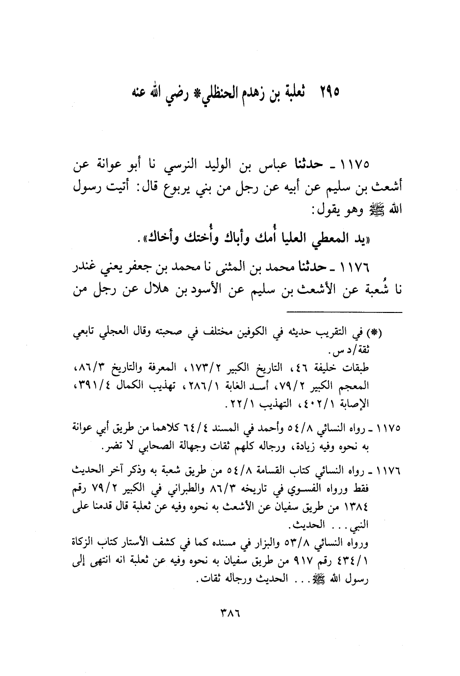 1176 - حَدَّثَنَا مُحَمَّدُ بْنُ الْمُثَنَّى، نا مُحَمَّدُ بْنُ جَعْفَرٍ يَعْنِي غُنْدَرًا، نا شُعْبَةُ، عَنِ الْأَشْعَثِ بْنِ سُلَيْمٍ، عَنِ الْأَسْوَدِ بْنِ هِلَالٍ، عَنْ رَجُلٍ، مِنْ ثَعْلَبَةَ، إِنَّ أُنَاسًا مِنْ ثَعْلَبَةَ بْنِ يَرْبُوعٍ أَتَوُا النَّبِيَّ صَلَّى اللهُ عَلَيْهِ وَسَلَّمَ فَانْتَهُوا إِلَيْهِ وَهُوَ يَقُولُ: «§يَدُ الرَّجُلِ الْعُلْيَا، أُمَّكَ وَأَبَاكَ، وَأُخْتَكَ وَأَخَاكَ , ثُمَّ أَدْنَاكَ أَدْنَاكَ» ، فَقَالَ رَجُلٌ لِلنَّبِيِّ صَلَّى اللهُ عَلَيْهِ وَسَلَّمَ: هَؤُلَاءِ بَنُو ثَعْلَبَةَ بْنِ يَرْبُوعٍ قَتَلَةُ فُلَانٍ، فَقَالَ رَسُولُ اللَّهِ صَلَّى اللهُ عَلَيْهِ وَسَلَّمَ: «لَا تَجْنِي نَفْسٌ عَلَى الْأُخْرَى»