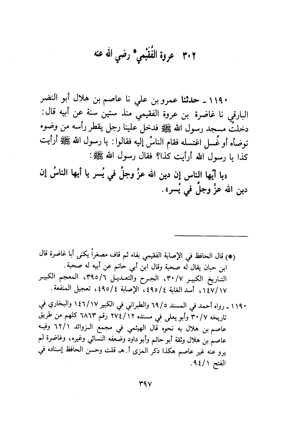 1190 - حَدَّثَنَا عَمْرُو بْنُ عَلِيٍّ، نا عَاصِمُ بْنُ هِلَالٍ أَبُو النَّضْرِ الْبَارِقِيُّ، نا غَاضِرَةُ بْنُ عُرْوَةَ الْفُقَيْمِيُّ ـ مُنْذُ سِتِّينَ سَنَةً ـ عَنْ أَبِيهِ قَالَ: دَخَلْتُ مَسْجِدَ رَسُولِ اللَّهِ صَلَّى اللهُ عَلَيْهِ وَسَلَّمَ فَدَخَلَ عَلَيْنَا رَجُلٌ يَقْطُرُ رَأْسَهُ مِنْ وَضُوءٍ تَوَضَّأَهُ أَوْ غُسْلٍ اغْتَسَلَهُ، فَقَامَ النَّاسُ إِلَيْهِ فَقَالُوا: يَا رَسُولَ اللَّهِ صَلَّى اللهُ عَلَيْهِ وَسَلَّمَ، أَرَأَيْتَ كَذَا، يَا رَسُولَ اللَّهِ أَرَأَيْتَ كَذَا، فَقَالَ رَسُولُ اللَّهِ صَلَّى اللهُ عَلَيْهِ وَسَلَّمَ: «§يَا أَيُّهَا النَّاسُ إِنَّ دِينَ اللَّهِ عَزَّ وَجَلَّ فِي يُسْرٍ، يَا أَيُّهَا النَّاسُ إِنَّ دِينَ اللَّهِ عَزَّ وَجَلَّ فِي يُسْرٍ»