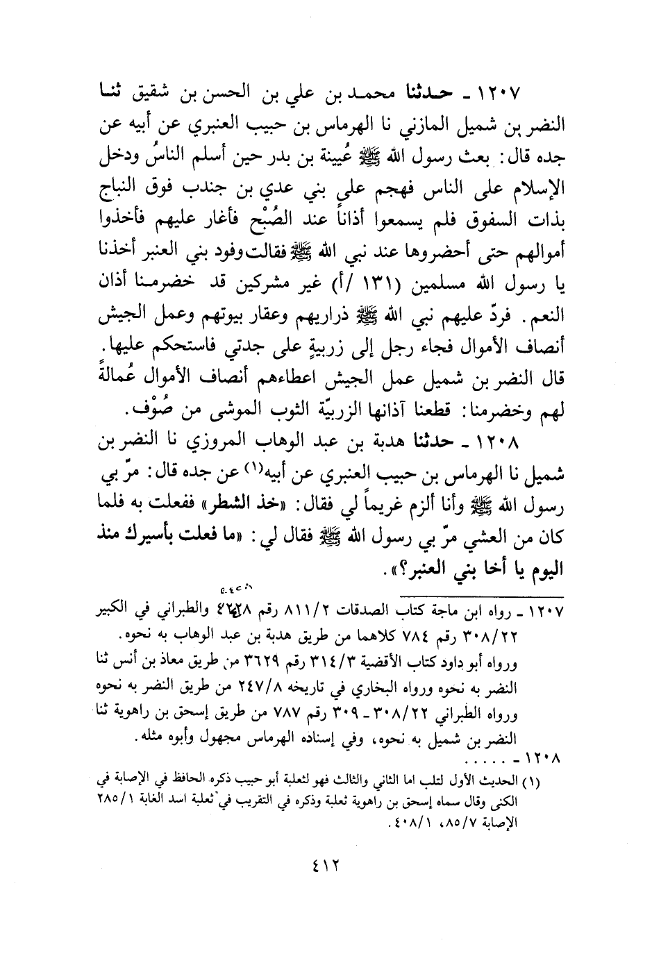 1207 - حَدَّثَنَا مُحَمَّدُ بْنُ عَلِيِّ بْنِ الْحَسَنِ بْنِ شَقِيقٍ، ثنا النَّضْرُ بْنُ شُمَيْلٍ الْمَازِنِيُّ، نا الْهِرْمَاسُ بْنُ حَبِيبٍ الْعَنْبَرِيُّ، عَنْ أَبِيهِ، عَنْ جَدِّهِ قَالَ: " §بَعَثَ رَسُولُ اللَّهِ صَلَّى اللهُ عَلَيْهِ وَسَلَّمَ عُيَيْنَةَ بْنَ بَدْرٍ حِينَ أَسْلَمَ النَّاسُ وَدَخَلَ الْإِسْلَامُ عَلَى النَّاسِ، فَهَجَمَ عَلَى بَنِي عَدِيِّ بْنِ جُنْدُبٍ فَوْقَ النِّبَاجِ بِذَاتِ السُّفُوقِ، فَلَمْ يَسْمَعُوا أَذَانًا عِنْدَ الصُّبْحِ فَأَغَارَ عَلَيْهِمْ، فَأَخَذُوا أَمْوَالَهُمْ حَتَّى أَحْضَرُوهَا عِنْدَ نَبِيِّ اللَّهِ صَلَّى اللهُ عَلَيْهِ وَسَلَّمَ، فَقَالَتْ وُفُودُ بَنِي الْعَنْبَرِ: أُخِذْنَا يَا رَسُولَ اللَّهِ مُسْلِمَيْنِ غَيْرَ مُشْرِكِينَ، قَدْ خَضْرَمْنَا آذَانَ النَّعَمِ، فَرَدَّ عَلَيْهِمْ نَبِيُّ اللَّهِ صَلَّى اللهُ عَلَيْهِ وَسَلَّمَ ذَرَارِيَّهُمْ وَعَقَارَ بُيُوتِهِمْ، وَعَمَلَ الْجَيْشِ أَنْصَافَ الْأَمْوَالِ، فَجَاءَ رَجُلٌ إِلَى زُرْبِيَّةٍ عَلَى جَدَّتِي، فَاسْتَحْكَمَ عَلَيْهَا "، قَالَ النَّضْرُ بْنُ شُمَيْلٍ: عَمَلُ الْجَيْشِ إِعْطَاءَهُمْ أَنْصَافَ الْأَمْوَالِ عُمَالَةً لَهُمْ، وَخَضْرَمْنَا: قَطَعْنَا آذَانَهَا، الزُّرْبِيَّةُ: الثَّوْبُ الْمُوَشَّى مِنْ صُوفٍ