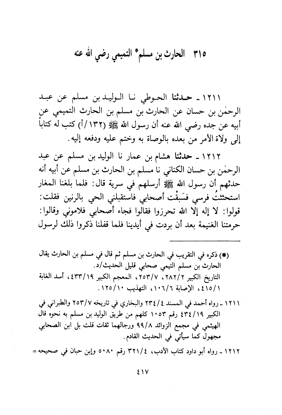 1212 - حَدَّثَنَا هِشَامُ بْنُ عَمَّارٍ، نا الْوَلِيدُ بْنُ مُسْلِمٍ، عَنْ عَبْدِ الرَّحْمَنِ بْنِ حَسَّانَ الْكِنَانِيِّ، نا مُسْلِمُ بْنُ الْحَارِثِ بْنِ مُسْلِمٍ، عَنْ أَبِيهِ أَنَّهُ حَدَّثَهُمْ أَنَّ رَسُولَ اللَّهِ صَلَّى اللهُ عَلَيْهِ وَسَلَّمَ أَرْسَلَهُمْ فِي سَرِيَّةٍ قَالَ: فَلَمَّا بَلَغَنَا الْمُغَارَ اسْتَحْثَثْتُ فَرْسَى، فَسَبَقْتُ أَصْحَابِي، فَاسْتَقْبَلَنِي الْحَيُّ بِالرَّنِينِ، فَقُلْتُ: قُولُوا: لَا إِلَهَ إِلَّا اللَّهُ تُحْرِزُوا، فَقَالَ: فَجَاءَ أَصْحَابِي فَلَامُونِي وَقَالُوا: حَرَمْتَنَا الْغَنِيمَةَ بَعْدَ أَنْ بَرَدَتْ فِي أَيْدِينَا، فَلَمَّا قَفَلْنَا ذَكَرُوا ذَلِكَ لِرَسُولِ اللَّهِ صَلَّى اللهُ عَلَيْهِ وَسَلَّمَ -[418]-، فَدَعَانِي فَحَسَّنَ لِي مَا صَنَعْتُ وَقَالَ لِي: «أَمَا إِنَّهُ قَدْ كُتِبَ لَكَ مَعَ كُلِّ إِنْسَانٍ مِنْهُمْ كَذَا كَذَا» ، قَالَ عَبْدُ الرَّحْمَنِ بْنُ حَسَّانَ أَنَا نَسِيتُهُ، قَالَ: ثُمَّ قَالَ رَسُولُ اللَّهِ صَلَّى اللهُ عَلَيْهِ وَسَلَّمَ: «أَمَا إِنِّي سَأَكْتُبُ لَكَ كِتَابًا أُوصِي بِكَ مَنْ يَكُونُ بَعْدِي مِنْ أَئِمَّةِ الْمُسْلِمِينَ» ، فَكَتَبَ لَهُ، وَخَتَمَ عَلَيْهِ، وَدَفَعَهُ إِلَيَّ وَقَالَ: " §إِذَا صَلَّيْتَ الْغَدَاةَ فَقُلْ قَبْلَ أَنْ تُكَلِّمَ أَحَدًا: اللَّهُمَّ أَجِرْنِي مِنَ النَّارِ، سَبْعَ مَرَّاتٍ، فَإِنَّكَ إِنْ مُتَّ مِنْ يَوْمِكَ كَتَبَ اللَّهُ عَزَّ وَجَلَّ لَكَ جَوَازًا مِنَ النَّارِ، سَبْعَ مَرَّاتٍ، وَإِذَا صَلَّيْتَ الْمَغْرِبَ فَقُلْ قَبْلَ أَنْ تُكَلِّمَ أَحَدًا اللَّهُمَّ أَجِرْنِي مِنَ النَّارِ، سَبْعَ مَرَّاتٍ، فَإِنَّكَ إِنْ مُتَّ مِنْ لَيْلَتِكَ كَتَبَ اللَّهُ لَكَ جَوَازًا مِنَ النَّارِ "، قَالَ: فَلَمَّا قُبِضَ رَسُولُ اللَّهِ صَلَّى اللهُ عَلَيْهِ وَسَلَّمَ أَتَيْتُ بِالْكِتَابِ أَبَا بَكْرٍ رَضِيَ اللَّهُ عَنْهُ فَفَضَّهُ فَقَرَأَهُ، وَأَمَرَ لِي وَخَتَمَهُ، ثُمَّ أَتَيْتُ عُمَرَ رَضِيَ اللَّهُ عَنْهُ فَفَعَلَ مِثْلَ ذَلِكَ، ثُمَّ أَتَيْتُ عُثْمَانَ رَضِيَ اللَّهُ عَنْهُ فَفَعَلَ مِثْلَ ذَلِكَ، قَالَ مُسْلِمٌ: فَتُوُفِّي الْحَارِثُ بْنُ مُسْلِمٍ رَضِيَ اللَّهُ عَنْهُ فِي خِلَافَةِ عُثْمَانَ رَضِيَ اللَّهُ عَنْهُ، فَكَانَ الْكِتَابُ عِنْدَنَا حَتَّى وُلِّيَ عُمَرُ بْنُ عَبْدِ الْعَزِيزِ فَكَتَبَ إِلَى الْعَامِلِ قِبَلَنَا: أَنْ أَشْخِصْ مُسْلِمَ بْنَ الْحَارِثِ بِكِتَابِ رَسُولِ اللَّهِ صَلَّى اللهُ عَلَيْهِ وَسَلَّمَ الَّذِي كَتَبَهُ لِأَبِيهِ، فَأُشْخِصْتُ إِلَيْهِ فَقَرَأَهُ وَأَمَرَ لِي ثُمَّ خَتْمَهُ، ثُمَّ قَالَ لِي: أَمَا إِنِّي لَمْ أَبْعَثْ إِلَيْكَ إِلَّا لَتُحَدِّثَنِي كَمَا حَدَّثَ أَبُوكَ عَنْ رَسُولِ اللَّهِ صَلَّى اللهُ عَلَيْهِ وَسَلَّمَ، قَالَ: فَحَدَّثْتُهُ بِالْحَدِيثِ عَلَى وَجْهِهِ