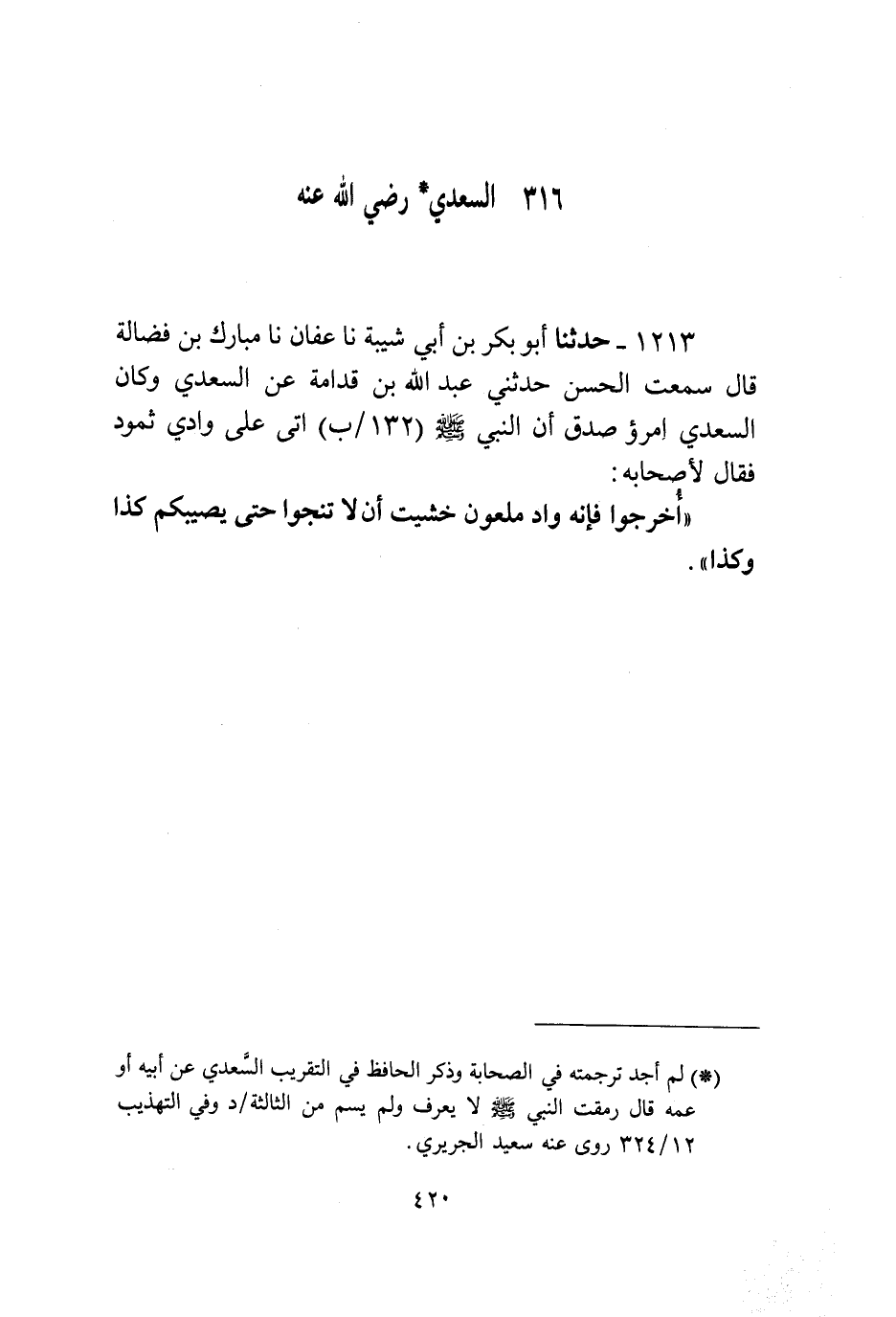 1213 - حَدَّثَنَا أَبُو بَكْرِ بْنُ أَبِي شَيْبَةَ، نا عَفَّانُ، نا مُبَارَكُ بْنُ فَضَالَةَ، قَالَ: سَمِعْتُ الْحَسَنَ، حَدَّثَنِي عَبْدُ اللَّهِ بْنُ قُدَامَةَ، عَنِ السَّعْدِيِّ، وَكَانَ السَّعْدِيُّ امْرَأَ صِدْقٍ، أَنَّ النَّبِيَّ صَلَّى اللهُ عَلَيْهِ وَسَلَّمَ أَتَى عَلَى وَادِي ثَمُودَ فَقَالَ لِأَصْحَابِهِ: «§اخْرُجُوا، فَإِنَّهُ وَادٍ مَلْعُونٌ، خَشِيتُ أَنْ لَا تَنْجُوا حَتَّى يُصِيبَكُمْ كَذَا وَكَذَا»