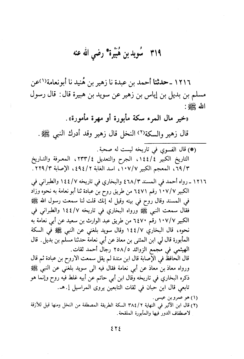 1216 - حَدَّثَنَا أَحْمَدُ بْنُ عَبْدَةَ، نا زُهَيْرُ بْنُ هُنَيْدٍ، نا أَبُو نَعَامَةَ، عَنْ مُسْلِمِ بْنِ بُدَيْلِ بْنِ إِيَاسِ بْنِ زُهَيْرٍ، عَنْ سُوَيْدِ بْنِ هُبَيْرَةَ قَالَ: قَالَ رَسُولُ اللَّهِ صَلَّى اللهُ عَلَيْهِ وَسَلَّمَ: «§خَيْرُ مَالِ الْمَرْءِ سِكَّةٌ مَأْبُورَةٌ، أَوْ مُهْرَةٌ مَأْمُورَةٌ» ، قَالَ زُهَيْرٌ: وَالسِّكَّةُ: النَّخْلُ، قَالَ زُهَيْرٌ: وَقَدْ أَدْرَكَ النَّبِيَّ صَلَّى اللهُ عَلَيْهِ وَسَلَّمَ