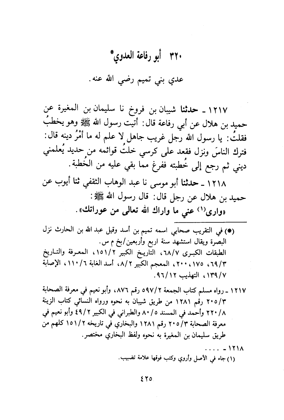 1217 - حَدَّثَنَا شَيْبَانُ بْنُ فَرُّوخٍ، نا سُلَيْمَانُ بْنُ الْمُغِيرَةِ، عَنْ حُمَيْدِ بْنِ هِلَالٍ، عَنْ أَبِي رِفَاعَةَ قَالَ: " أَتَيْتُ رَسُولَ اللَّهِ صَلَّى اللهُ عَلَيْهِ وَسَلَّمَ وَهُوَ يَخْطُبُ فَقُلْتُ: يَا رَسُولَ اللَّهِ، رَجُلٌ غَرِيبٌ جَاهِلٌ، لَا عِلْمَ لَهُ مَا أَمْرُ دِينِهِ، قَالَ: §فَتَرَكَ النَّاسَ وَنَزَلَ فَقَعَدَ عَلَى كُرْسِيٍّ خَلَتْ قَوَائِمُهُ مِنْ حَدِيدٍ يُعَلِّمُنِي دِينِي، ثُمَّ رَجَعَ إِلَى خُطْبَتِهِ فَفَرَغَ مِمَّا بَقِيَ عَلَيْهِ مِنَ الْخُطْبَةِ "