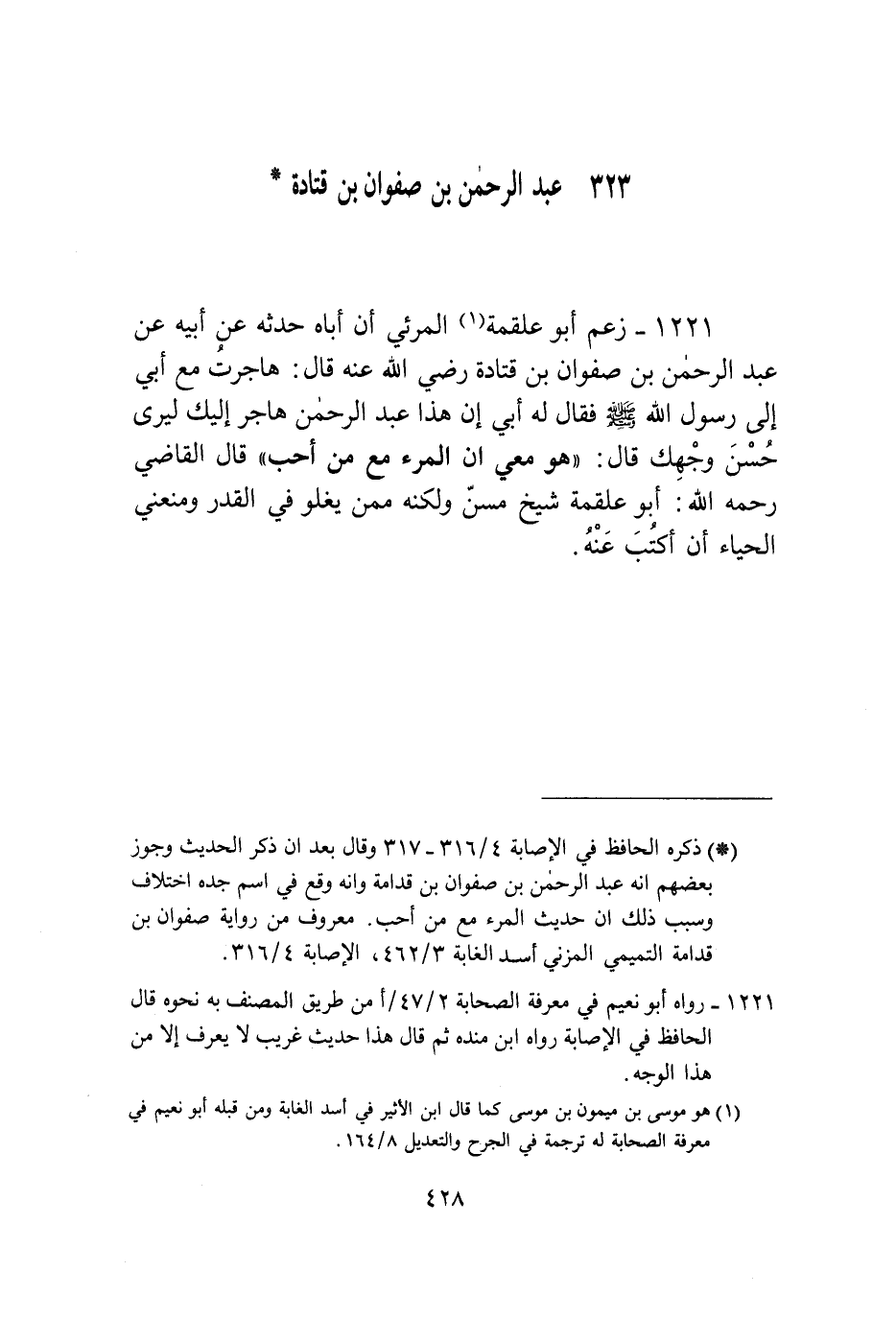 1221 - زَعَمَ أَبُو عَلْقَمَةَ الْمَرَئِيُّ أَنَّ أَبَاهُ حَدَّثَهُ عَنْ أَبِيهِ، عَنْ عَبْدِ الرَّحْمَنِ بْنِ صَفْوَانَ بْنِ قَتَادَةَ رَضِيَ اللَّهُ عَنْهُ قَالَ: هَاجَرَتُ مَعَ أَبِي إِلَى رَسُولِ اللَّهِ صَلَّى اللهُ عَلَيْهِ وَسَلَّمَ، فَقَالَ لَهُ أَبِي: إِنَّ هَذَا عَبْدُ الرَّحْمَنِ، هَاجَرَ إِلَيْكَ لِيَرَى حُسْنَ وَجْهِكَ، قَالَ: «§هُوَ مَعِي، إِنَّ الْمَرْءَ مَعَ مَنْ أَحَبَّ» قَالَ الْقَاضِي رَحِمَهُ اللَّهُ: أَبُو عَلْقَمَةَ شَيْخٌ مُسِنٌّ، وَلَكِنَّهُ مِمَّنْ يَغْلُو فِي الْقَدَرِ، وَمَنَعَنِي الْحَيَاءُ أَنْ أَكْتُبْ عَنْهُ