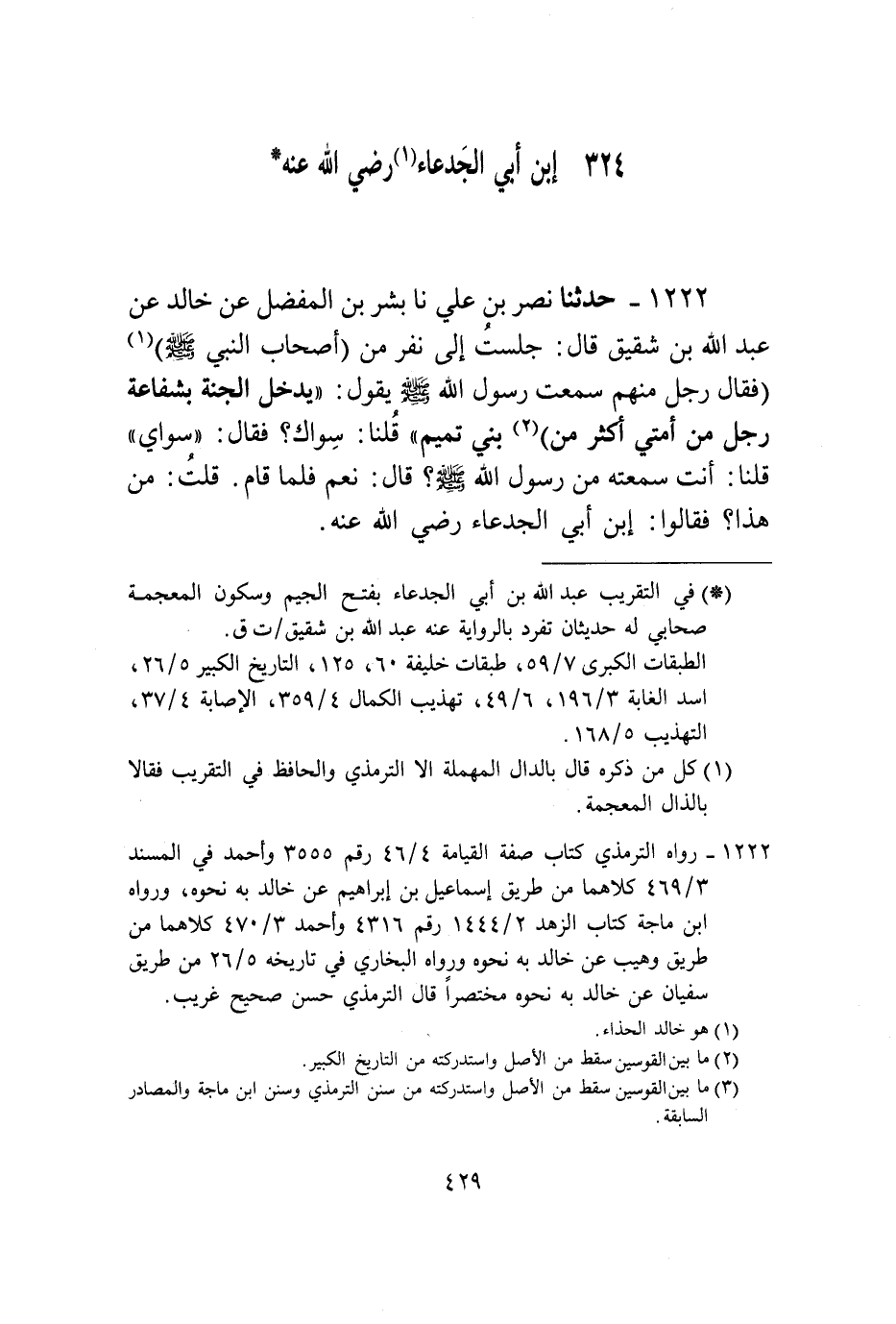 1222 - حَدَّثَنَا نَصْرُ بْنُ عَلِيٍّ، نا بِشْرُ بْنُ الْمُفَضَّلِ، عَنْ خَالِدٍ، عَنْ عَبْدِ اللَّهِ بْنِ شَقِيقٍ قَالَ: جَلَسْتُ إِلَى نَفَرٍ مِنْ أَصْحَابِ النَّبِيِّ صَلَّى اللهُ عَلَيْهِ وَسَلَّمَ، فَقَالَ رَجُلٌ مِنْهُمْ: سَمِعْتُ رَسُولَ اللَّهِ صَلَّى اللهُ عَلَيْهِ وَسَلَّمَ يَقُولُ: «§يَدْخُلُ الْجَنَّةَ بِشَفَاعَةِ رَجُلٍ مِنْ أُمَّتِي أَكْثَرُ مِنْ بَنِي تَمِيمٍ» ، قُلْنَا: سِوَاكَ؟ فَقَالَ: «سِوَايَ» ، قُلْنَا: أَنْتَ سَمِعْتَهُ مِنْ رَسُولِ اللَّهِ صَلَّى اللهُ عَلَيْهِ وَسَلَّمَ؟ قَالَ: نَعَمْ، فَلَمَّا قَامَ قُلْتُ: مَنْ هَذَا؟ فَقَالُوا: ابْنُ أَبَى الْجَدْعَاءِ رَضِيَ اللَّهُ عَنْهُ
