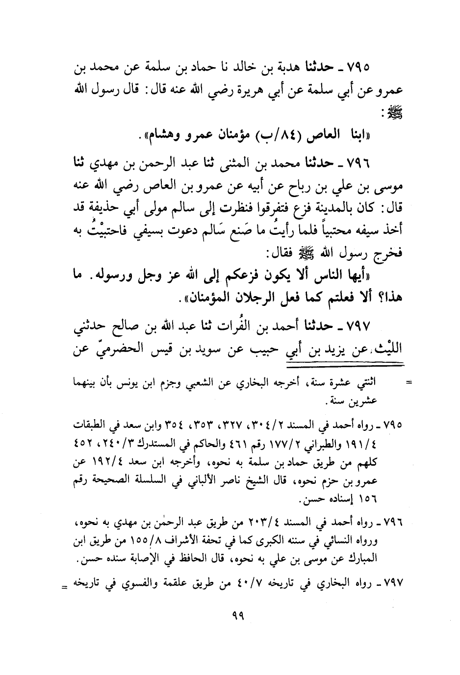 795 - حَدَّثَنَا هُدْبَةُ بْنُ خَالِدٍ، نا حَمَّادُ بْنُ سَلَمَةَ، عَنْ مُحَمَّدِ بْنِ عَمْرٍو، عَنْ أَبِي سَلَمَةَ، عَنْ أَبِي هُرَيْرَةَ رَضِيَ اللَّهُ عَنْهُ قَالَ: قَالَ رَسُولُ اللَّهِ صَلَّى اللهُ عَلَيْهِ وَسَلَّمَ: «§ابْنَا الْعَاصِ مُؤْمِنَانِ، عَمْرٌو وَهِشَامٌ»